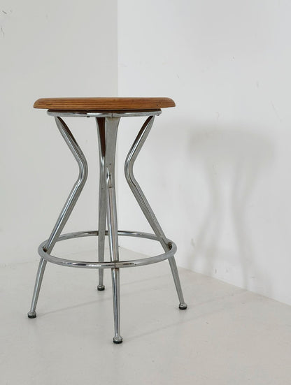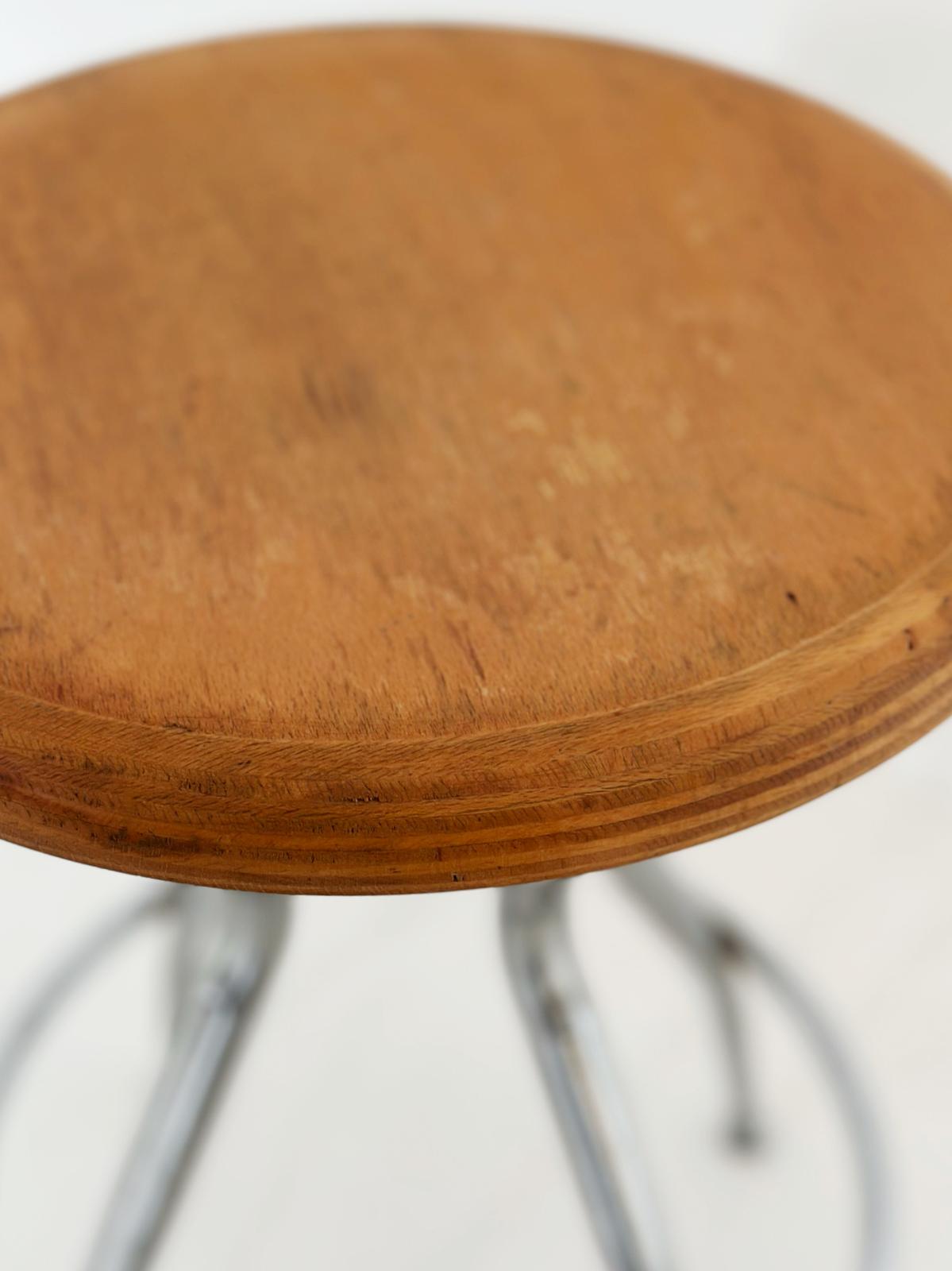 Sgabellino industriale,1960, struttura in alluminio, seduta tonda in legno