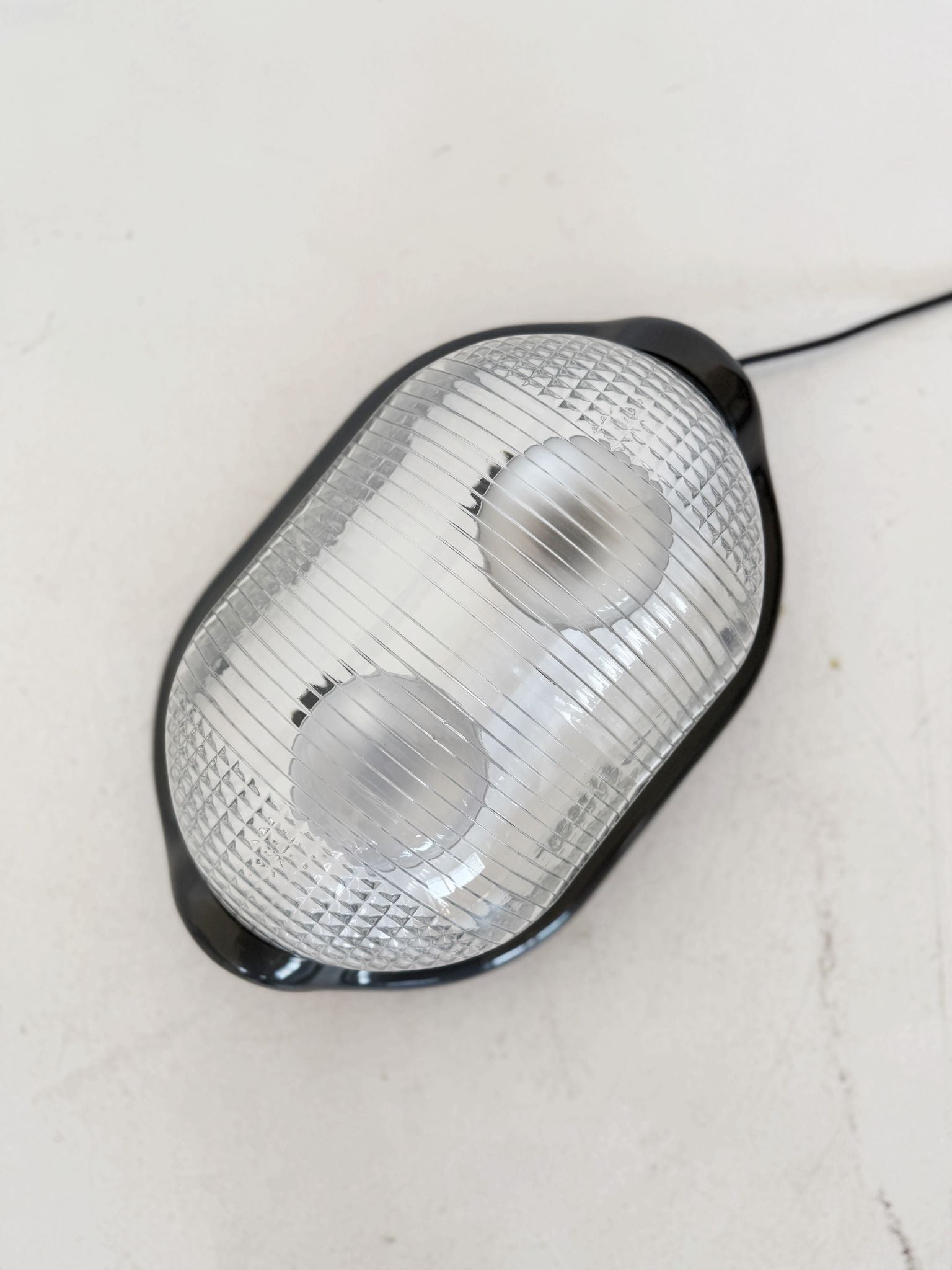 Il corpo dalla linea morbida e continua accoglie un ampio diffusore in vetro prismatizzato, ispirato alle vecchie plafoniere industriali, ma rivisitato con lo sguardo giocoso e rigoroso di Castiglioni. All’interno, due lampadine orientabili su supporto snodato permettono di modulare l’illuminazione in base all’uso e all’ambiente.