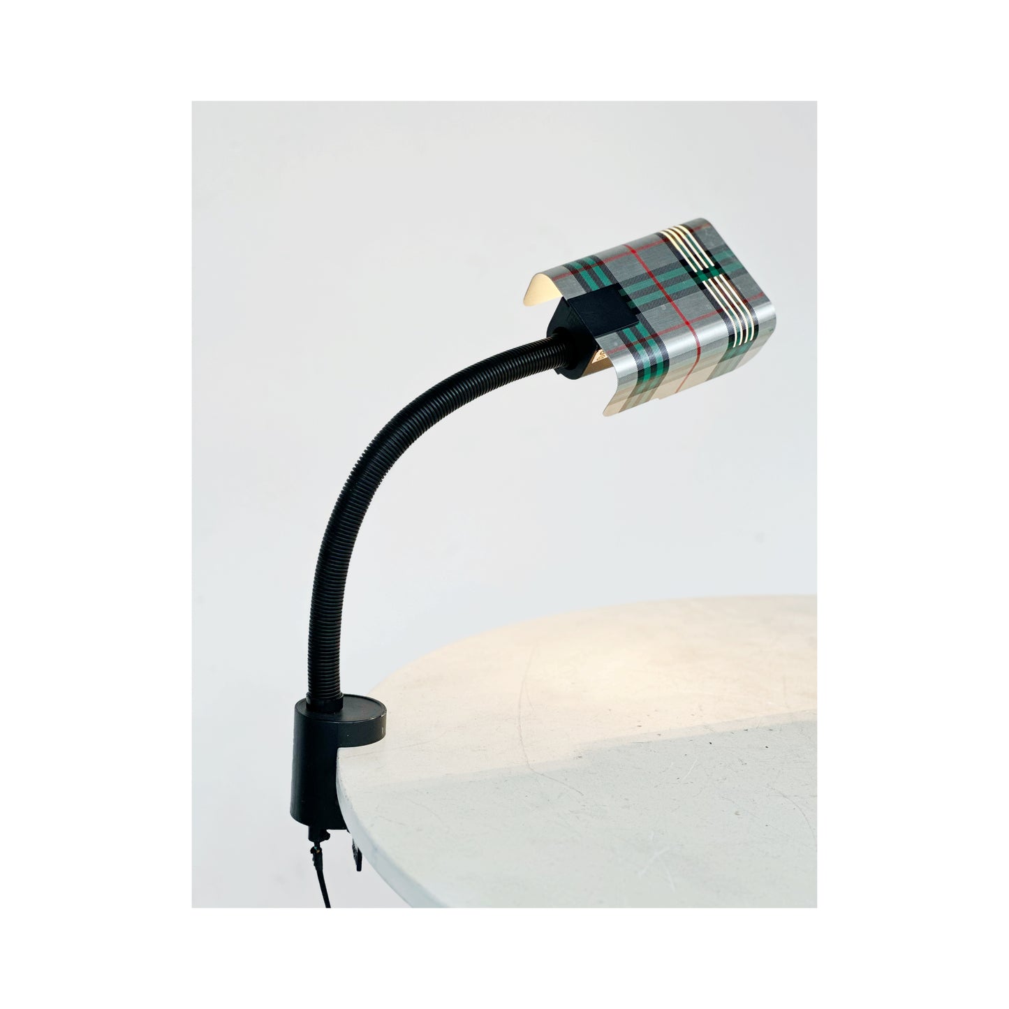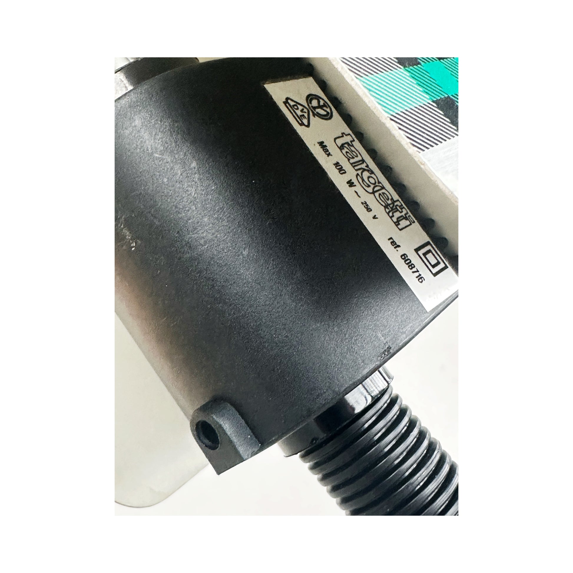 Lampada a morsetto Targetti,1970, struttura in plastica nera, lampada in alluminio scozzese