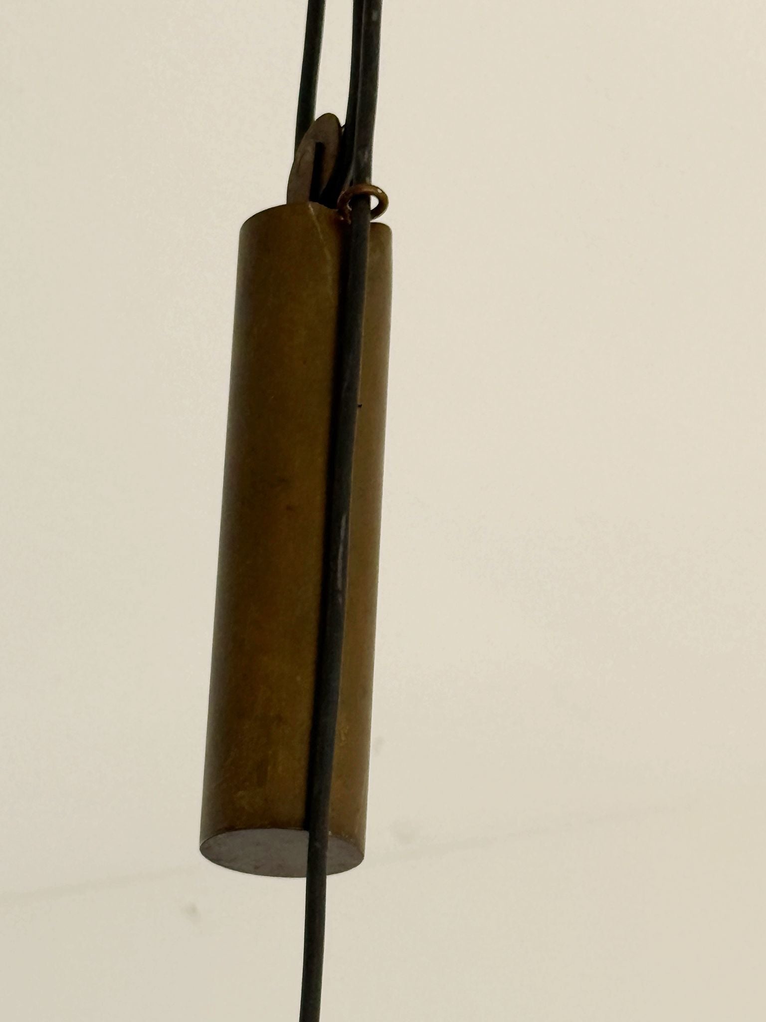 L’elemento più interessante è il contrappeso cilindrico in ottone brunito, tipico dei modelli a carrucola degli anni ’60/’70: permette di regolare l’altezza della sospensione con un gesto, aggiungendo un fascino meccanico d’epoca.