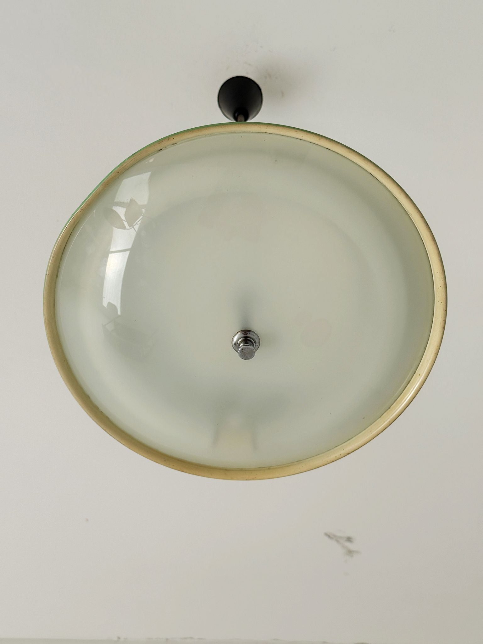 Lampadario a sospensione in metallo verniciato verde pastello con diffusore in vetro opalino satinato. Il corpo conico, slanciato e leggermente svasato, è raccordato al rosone tramite un’asta in metallo e dettagli in bachelite/ABS nera. La luce, schermata dal vetro circolare fissato con vite centrale in metallo cromato, è diffusa in modo morbido e uniforme.