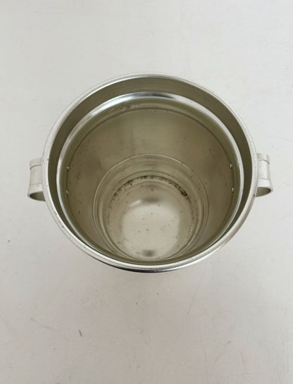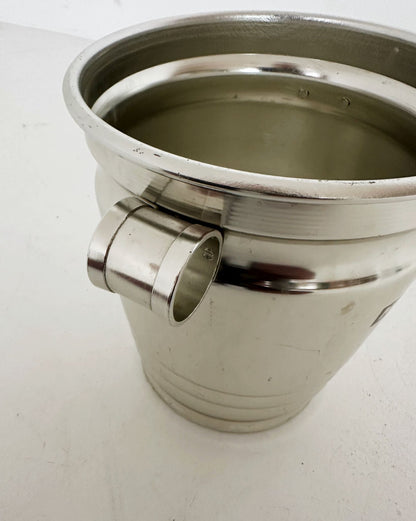 Si tratta di un secchiello per il ghiaccio dal design classico e funzionale, realizzato in metallo argentato con finitura lucida. E' dotato di due maniglie ad anello sui lati, che ne facilitano il trasporto. Sulla parte frontale è presente il logo "MARTINI" con il tipico sfondo rosso e scritta nera, dettaglio che richiama lo stile vintage e pubblicitario del famoso marchio italiano. La sua forma leggermente affusolata e il bordo superiore piatto lo rendono ideale per raffreddare bottiglie di vino o spumante, perfetto per occasioni eleganti o per dare un tocco retrò ad una cena o un evento.