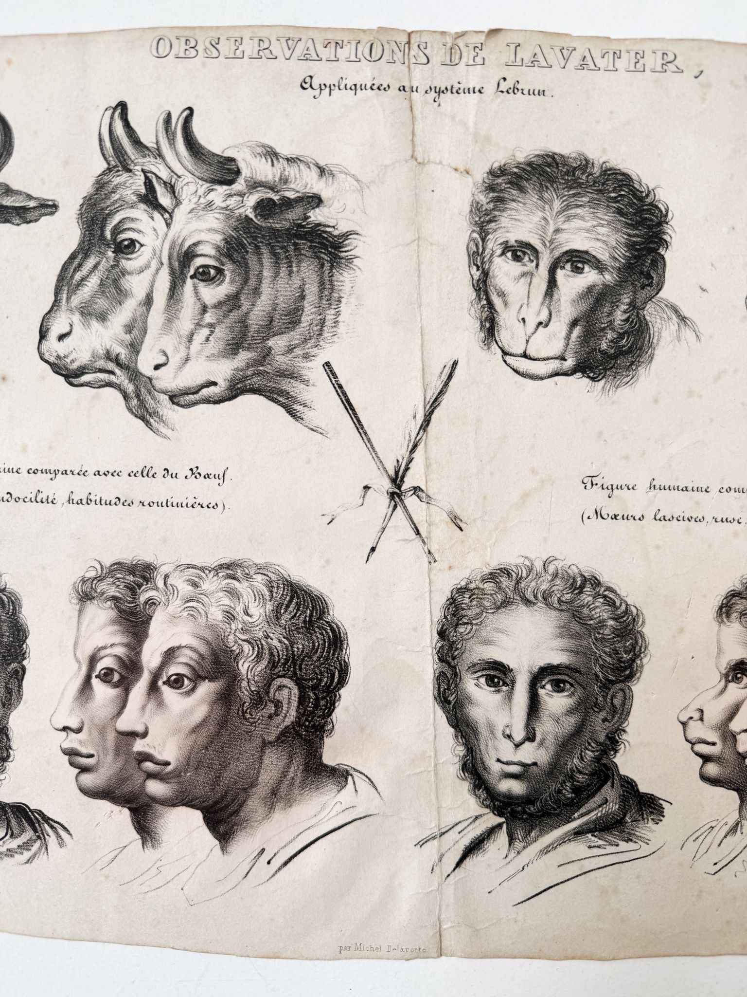 L’opera, incisa da Michel Delaporte, mostra una serie di confronti tra profili umani e teste animali — in questo caso il bue e la scimmia — per illustrare come, secondo la teoria fisiognomica, le espressioni e le proporzioni del volto umano potessero rivelare virtù o difetti interiori.