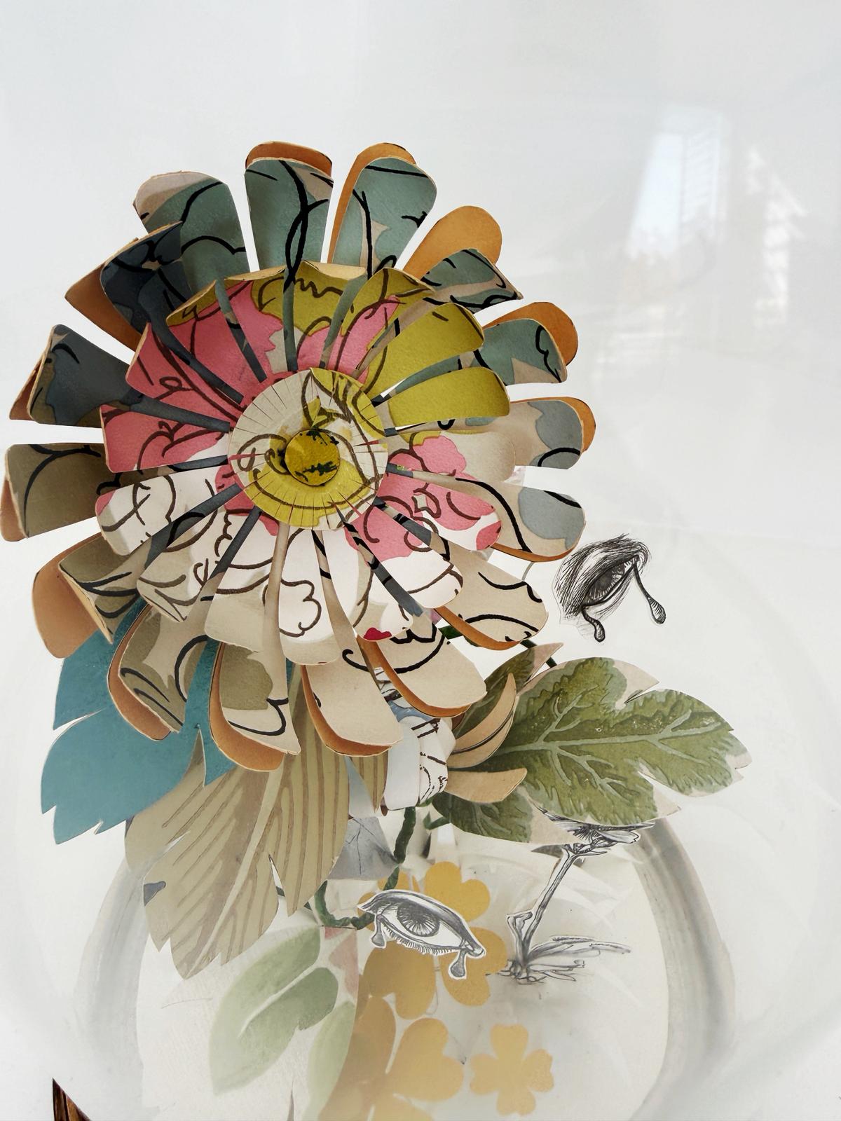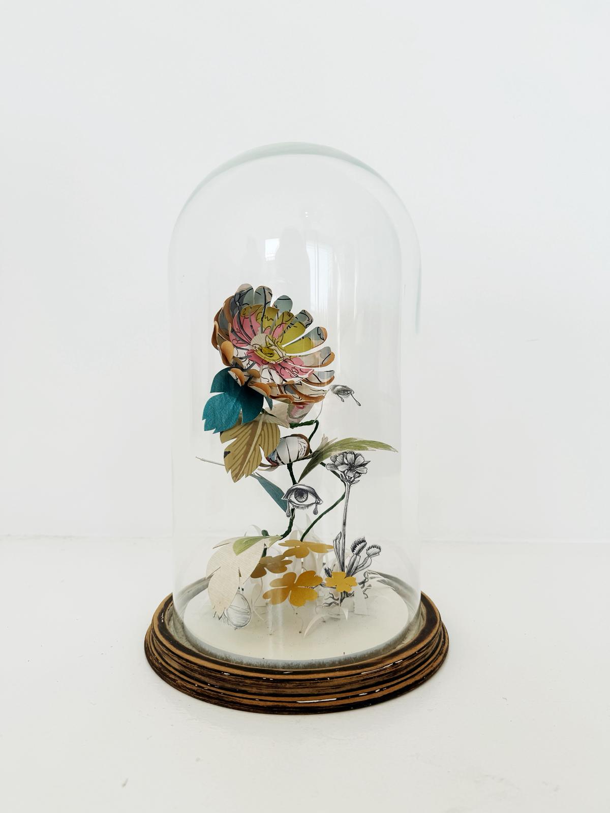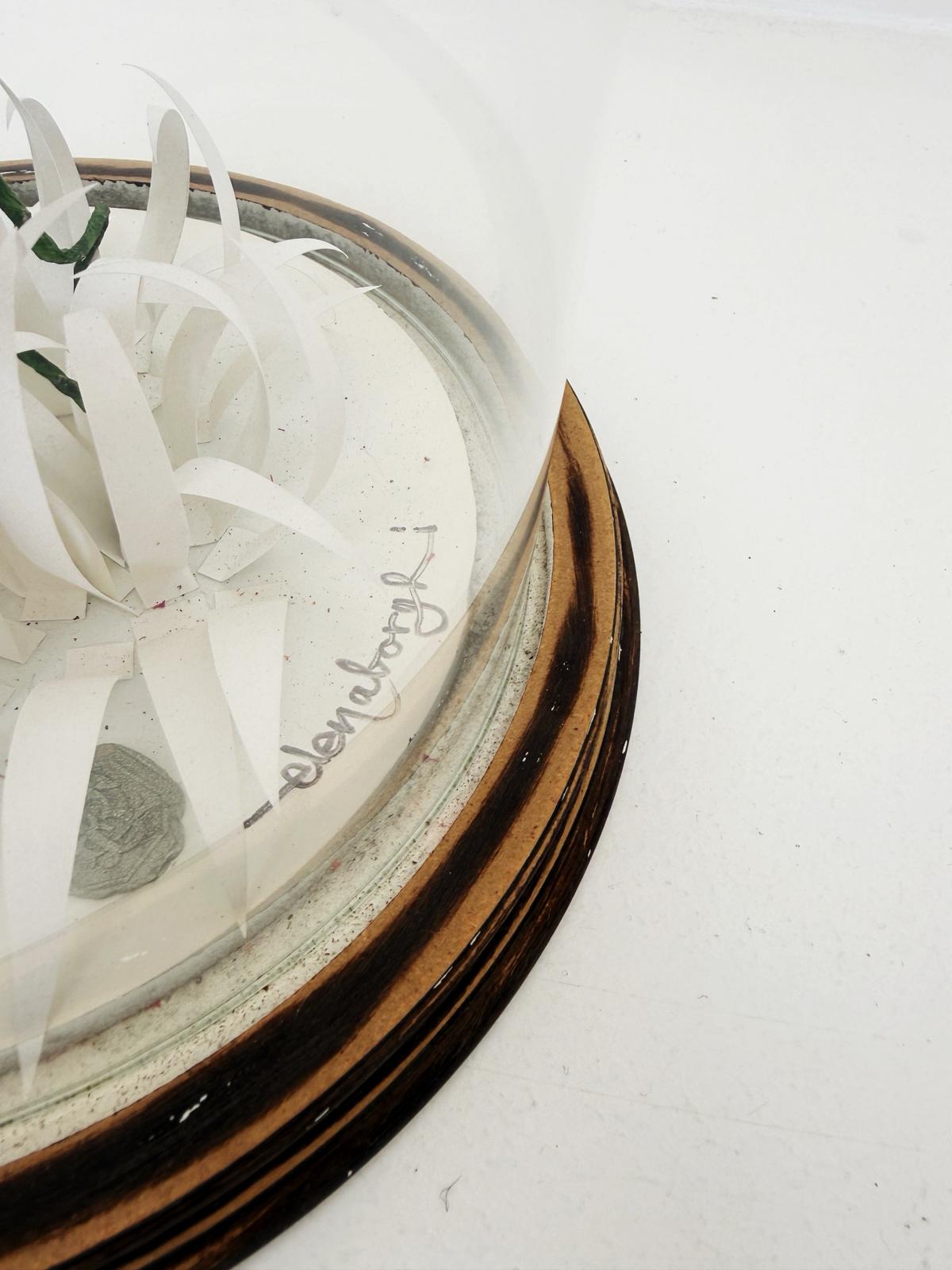 Campanelle di vetro con base in legno. Realizzate in carta, con occhi in legno dipinti a mano.
