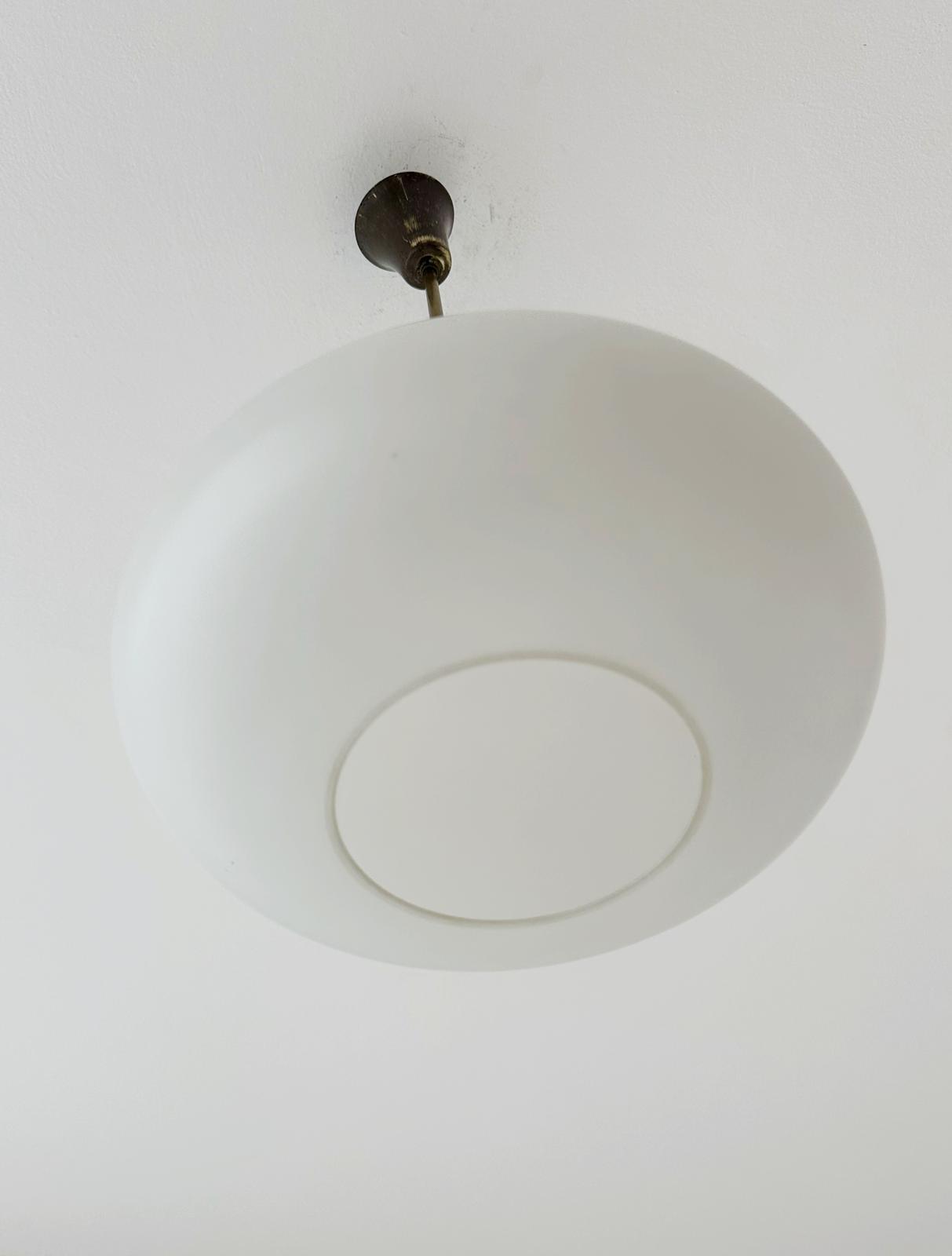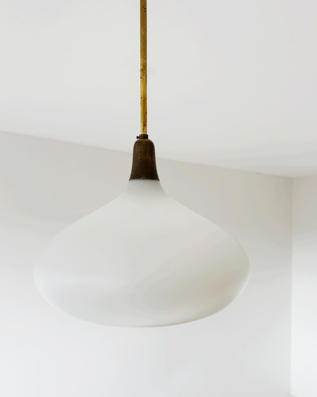 Lampadario,1960, struttura in ottone, lampada in vetro opalino