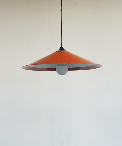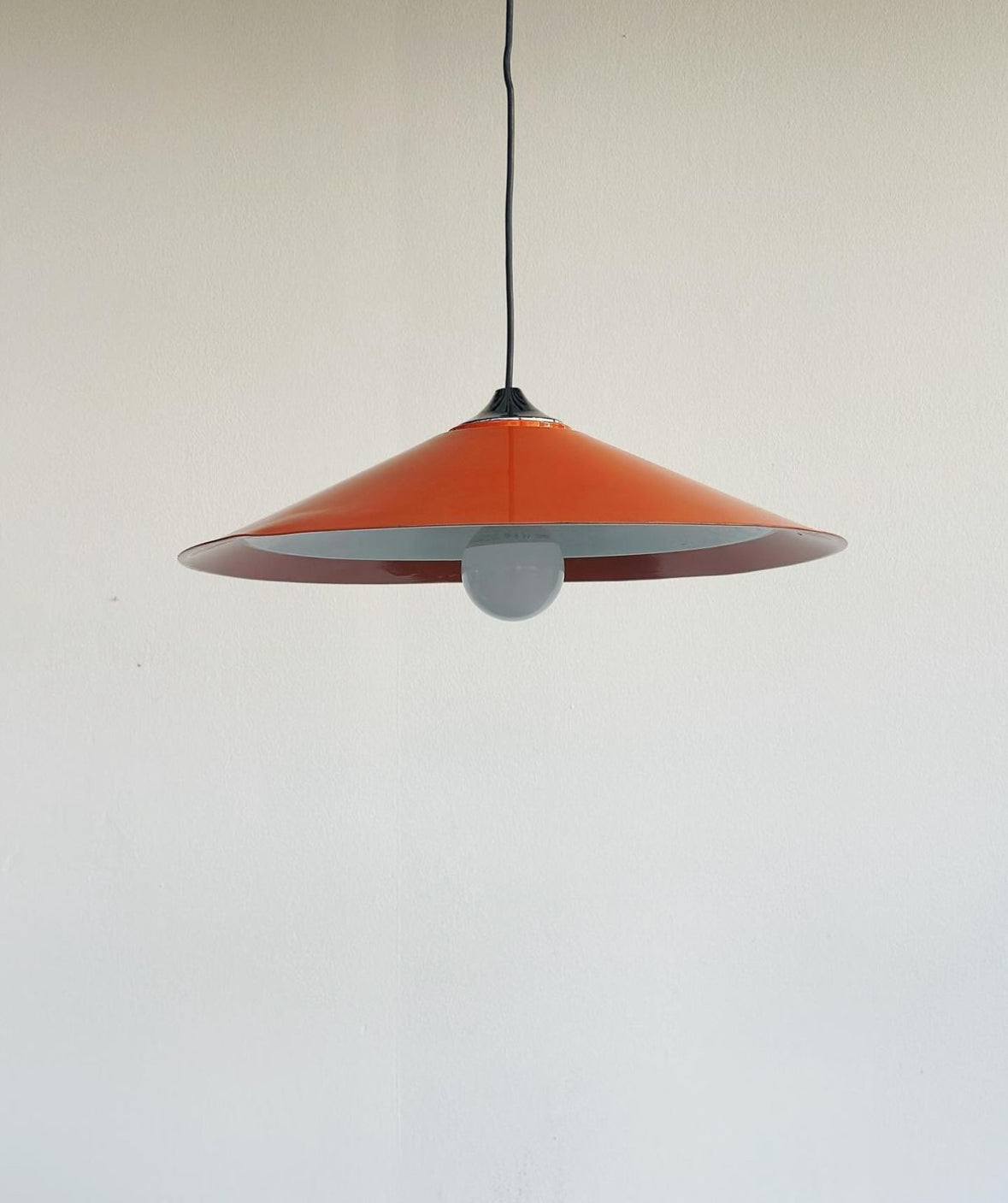 Lampadario,1970, lampada in alluminio arancione, con dettaglio cromato