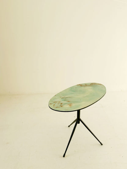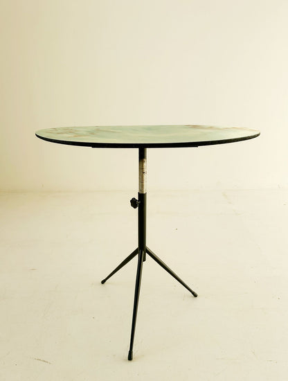 Tavolino,1960, struttura in metallo nero, piano ovale in laminato finto marmo, altezza regolabile