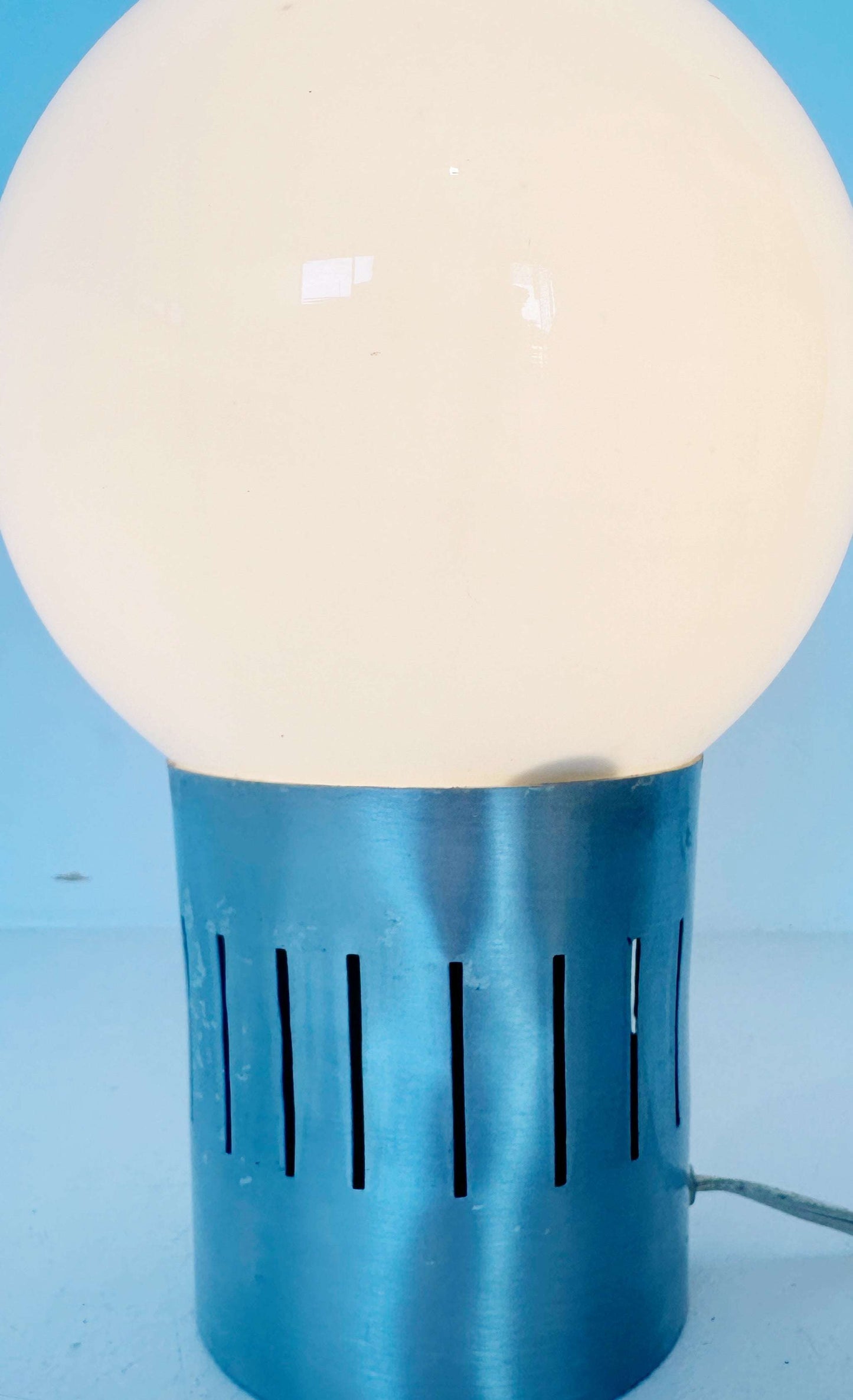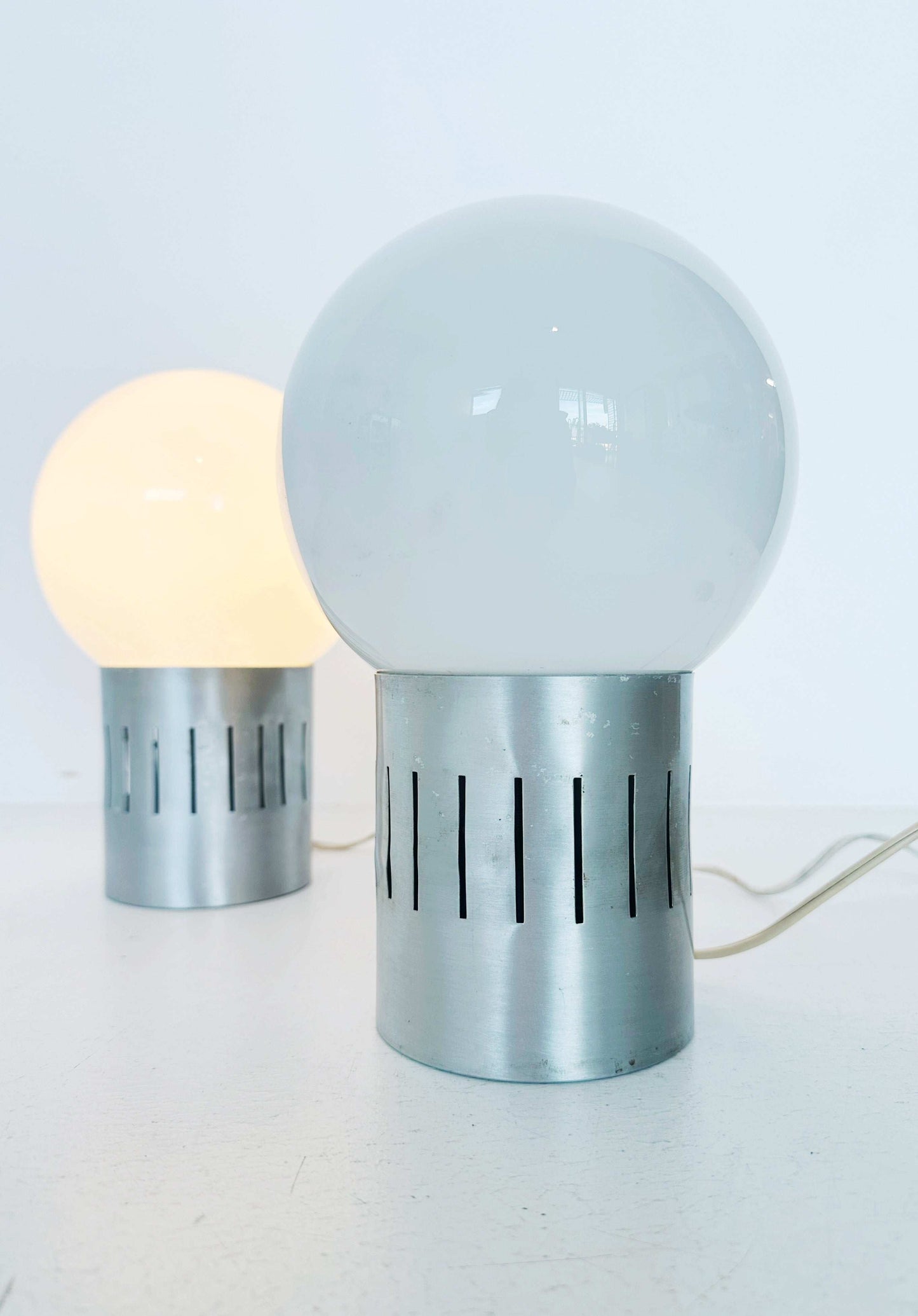Coppia di lampade in alluminio satinato e globo in vetro opalino 1970