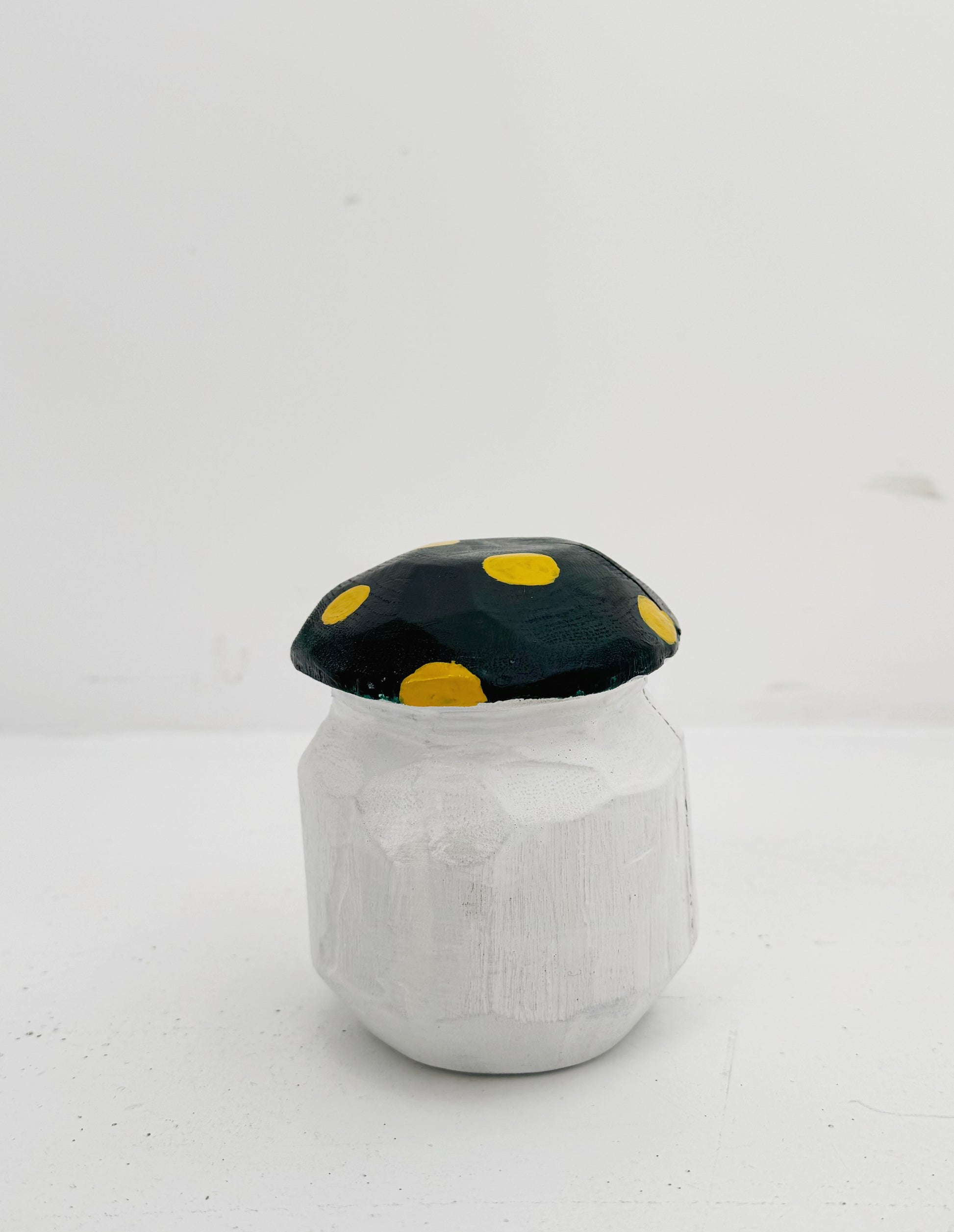 Il cappello verde scuro, decorato con pois gialli dipinti a mano, richiama l’estetica giocosa e naturale del sottobosco. Il corpo, lasciato in tonalità chiara, mette in risalto le naturali venature del legno, valorizzate da una lavorazione manuale che rende ogni pezzo unico.
