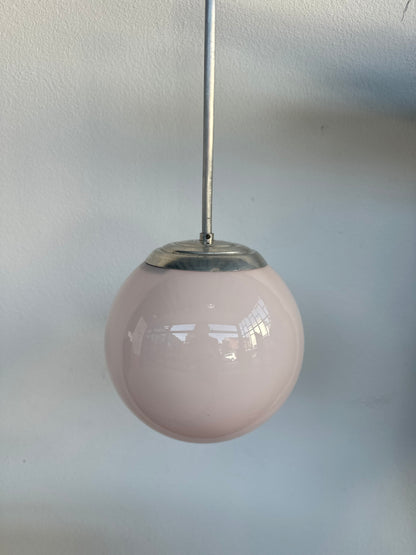 Lampadario,1960, struttura in alluminio e sfera in vetro rosa