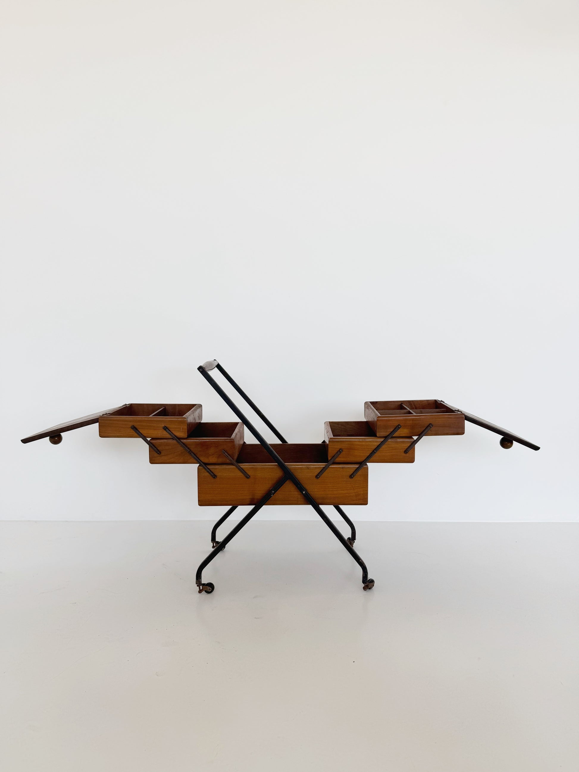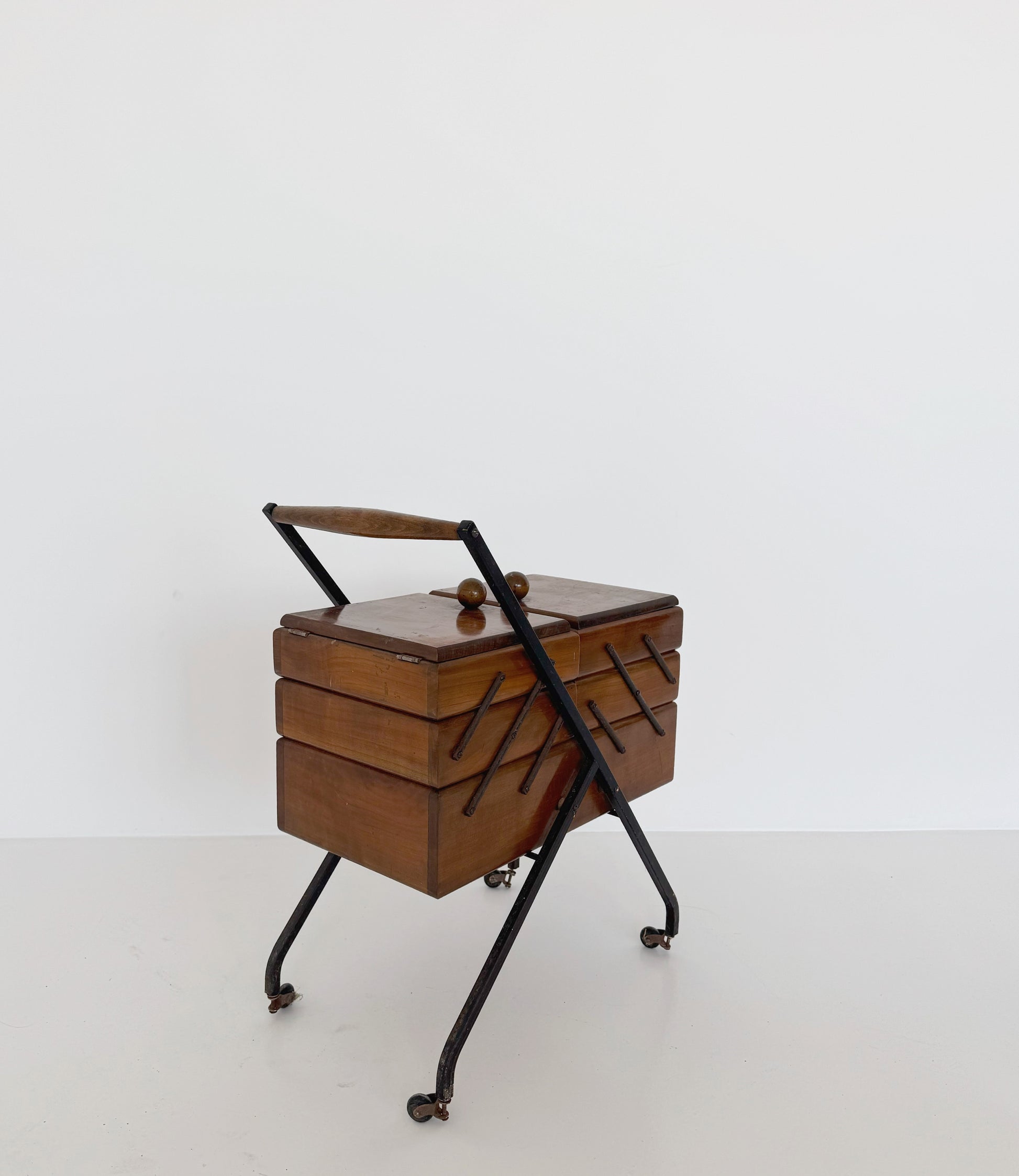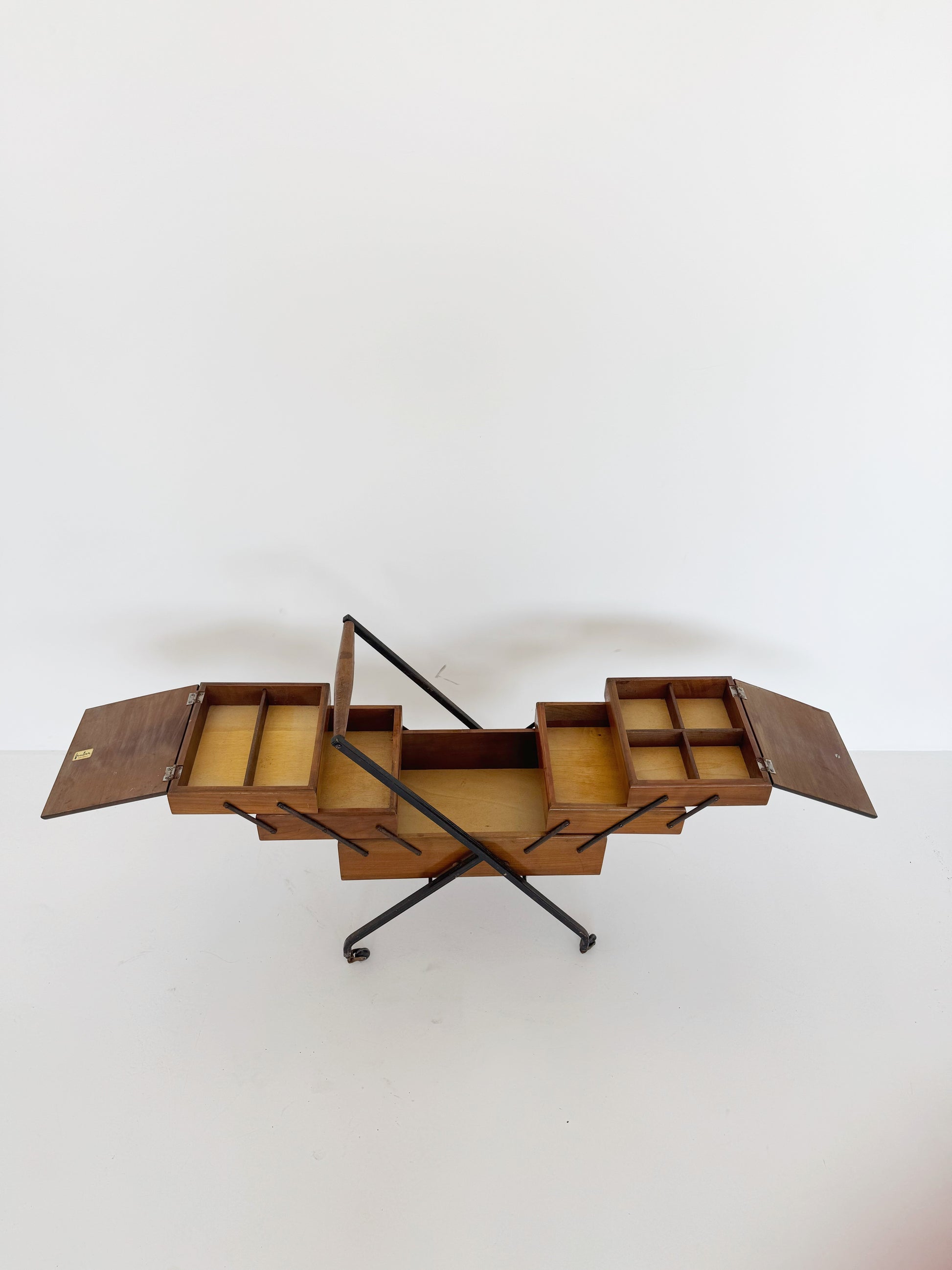 Portacucito,1960, struttura in metallo nero con ruote, portacuhcito in legno, con cinque scomparti