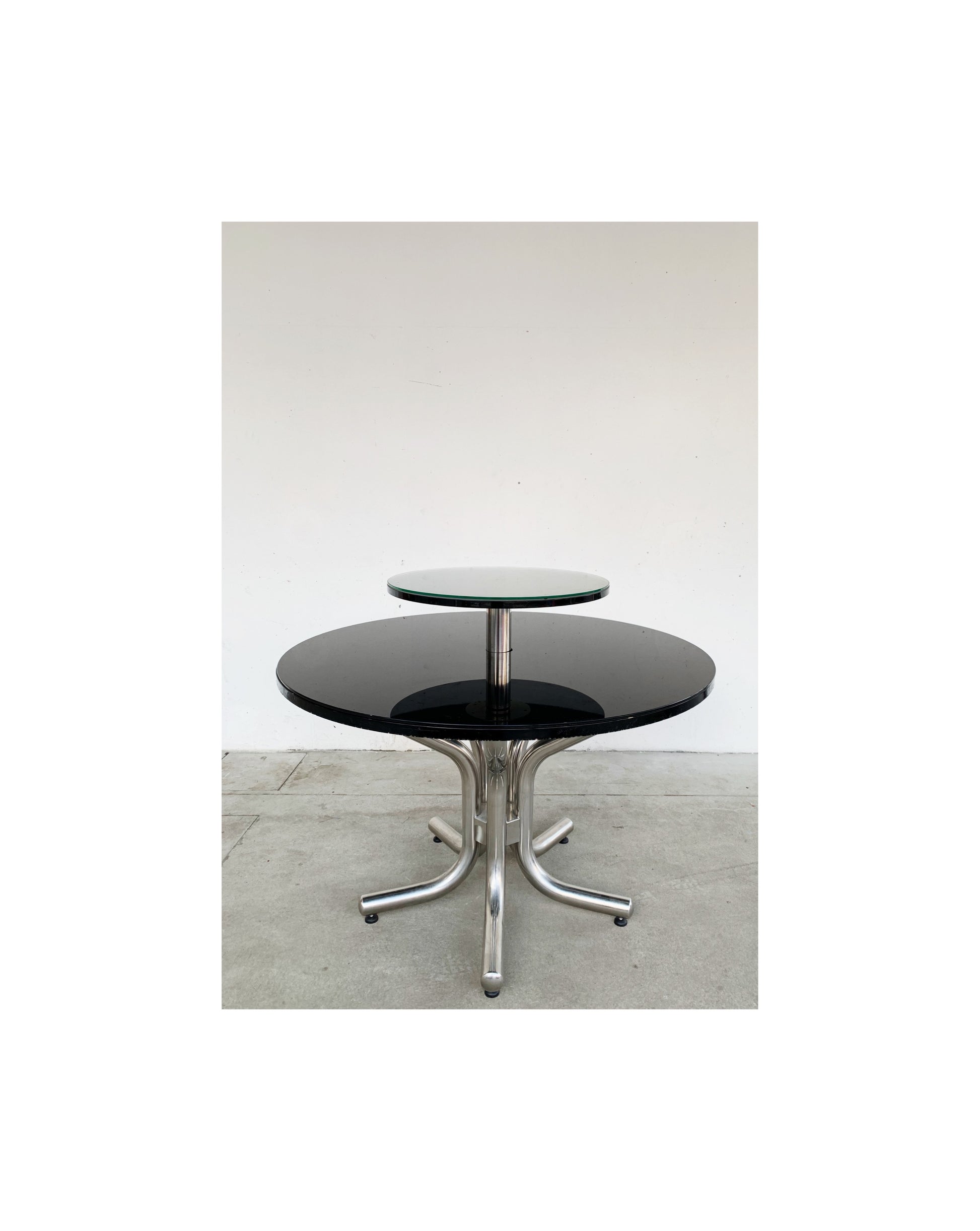 Tavolo, piano rotondo in legno e vetro nero, struttura in metallo cromato, ripiano rotondo girevole in legno e vetro