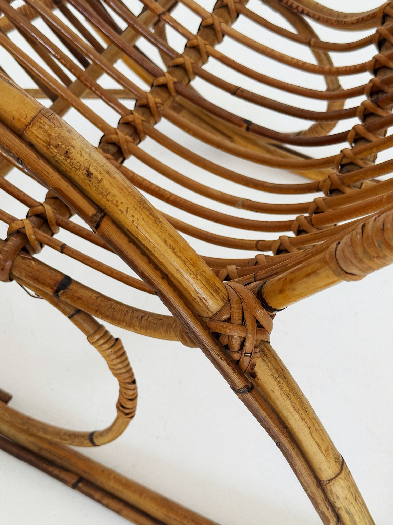 Il rattan ha mantenuto nel tempo una bella patina dorata, con lievi segni coerenti con l’età e l’uso.