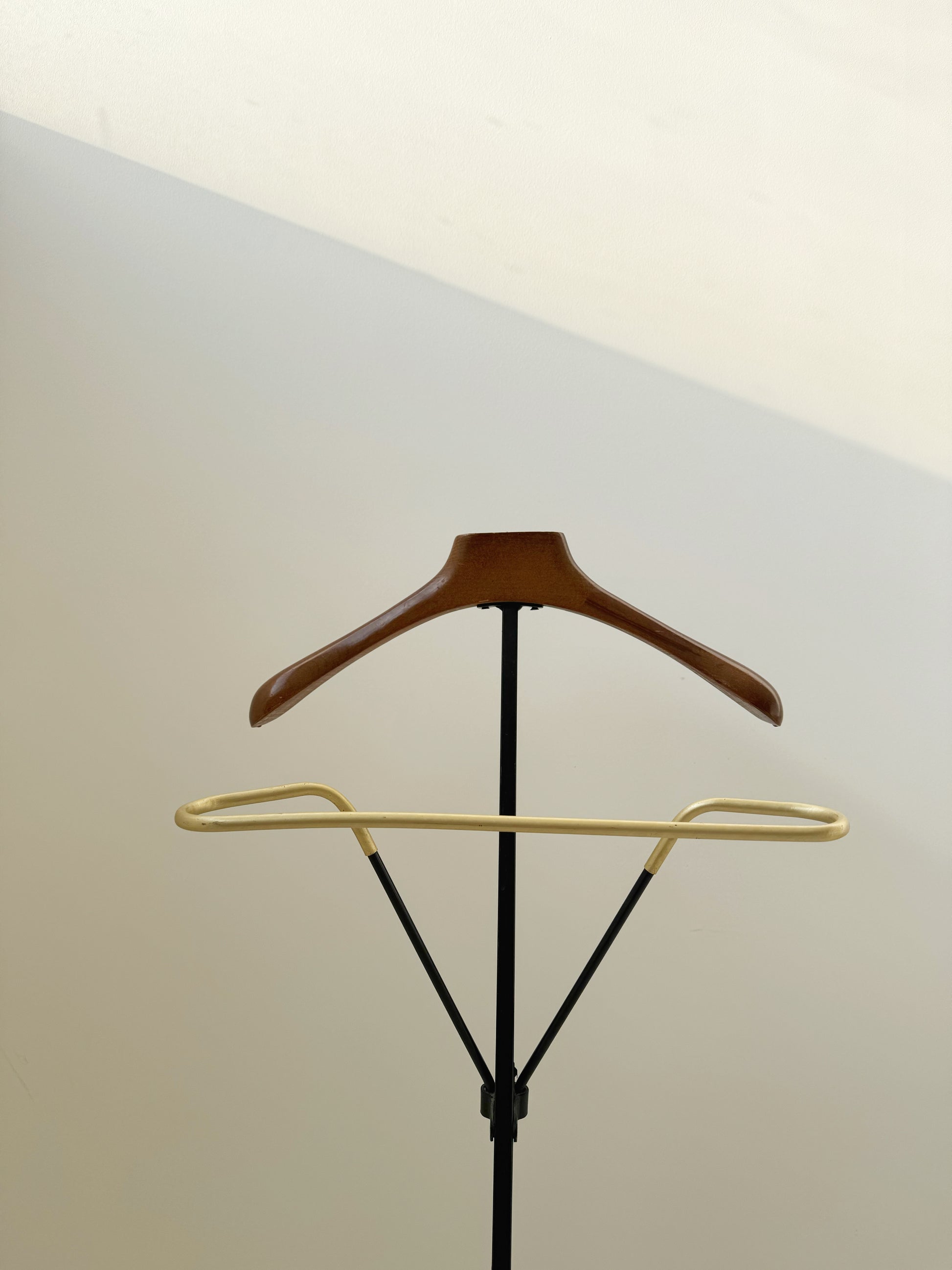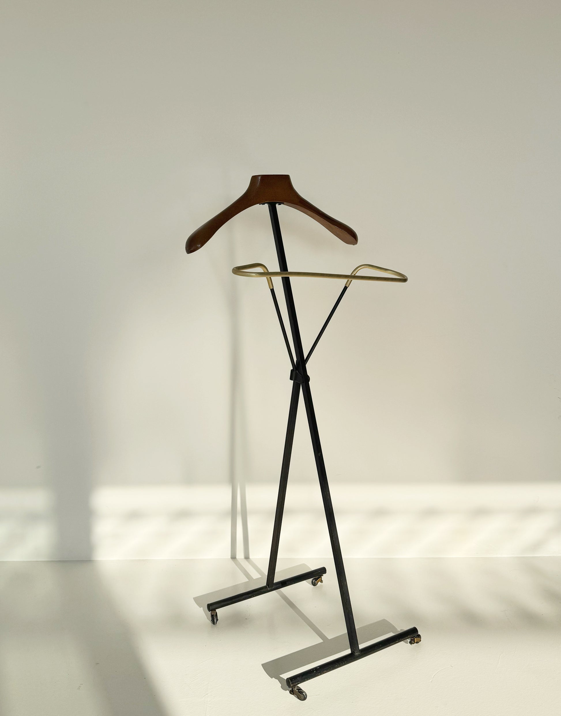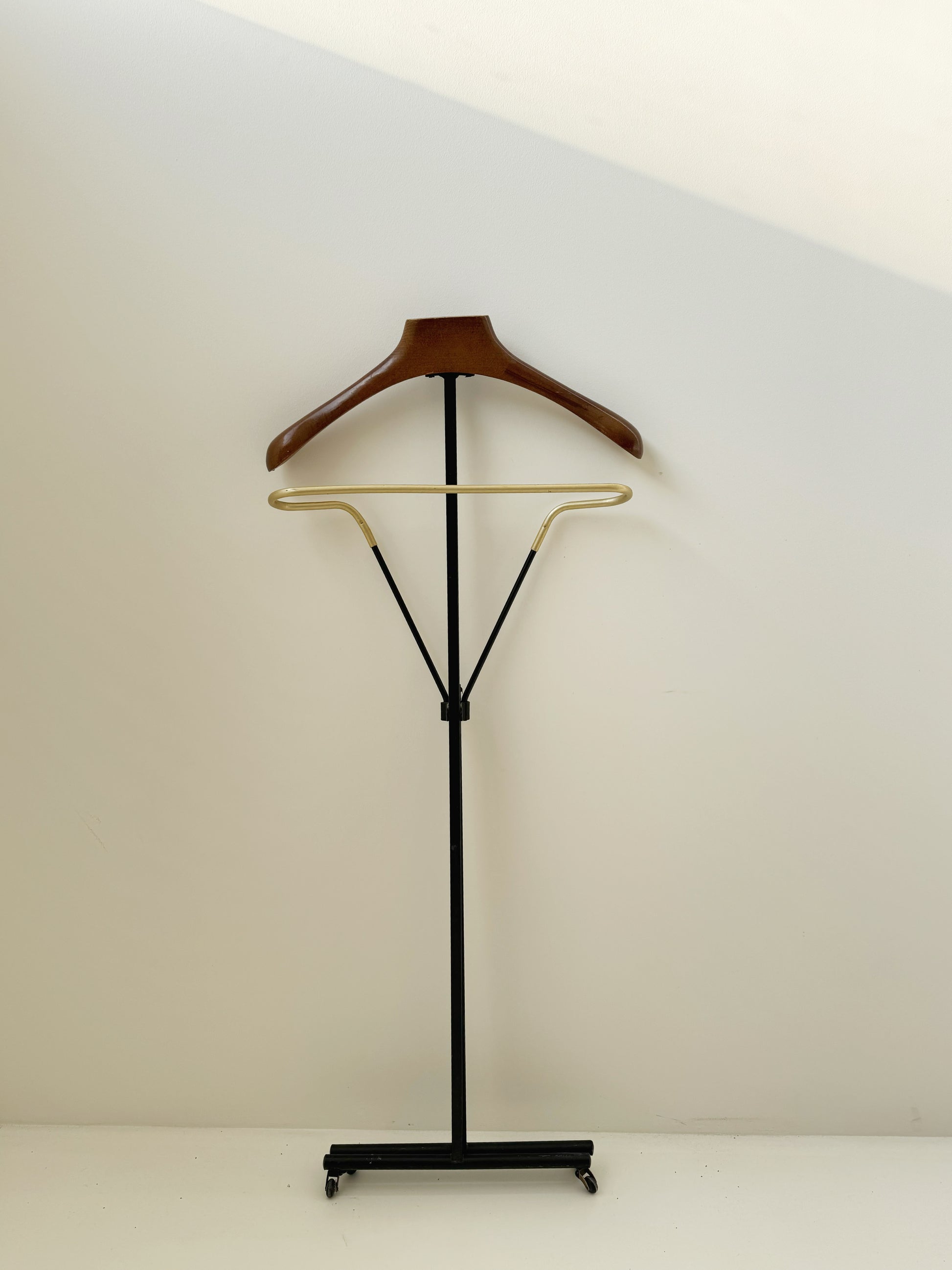 Servomuto,1960, struttura in metallo nero, appendini in legno e metallo ottonato, struttura richiudibile con ruote