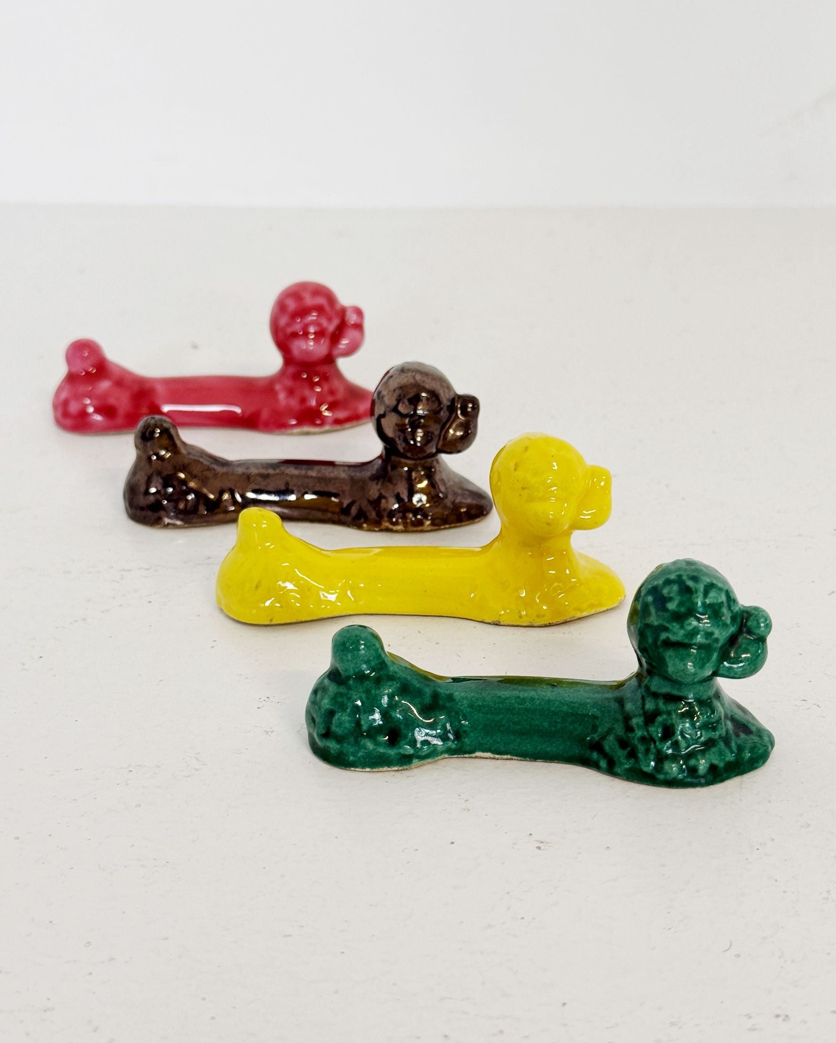 Set of four glazed ceramic cutlery rests in the shape of a reclining poodle, made between the 1960s and 1970s. Each piece features the typical poodle silhouette—a curly head, round muzzle, and elongated body—reinterpreted in a playful and decorative way. The set is composed of four different colors: raspberry red, lemon yellow, bottle green, and dark metallic glaze. The glossy surfaces and slight irregularities are characteristic of the craftsmanship of the era. An unusual and irresistible table decoration, perfect for adding a vintage, ironic, and colorful touch to your table setting. ⸻ Details • Type: Set of 4 cutlery rests • Design: Poodle • Period: 1960s–1970s • Material: Glazed ceramic • Colors: Red, yellow, green, dark metallic • Condition: Very good