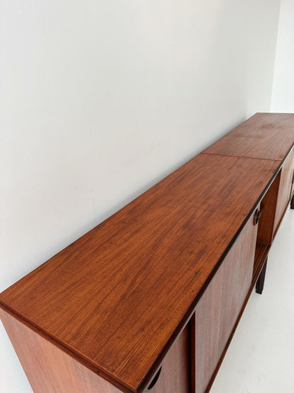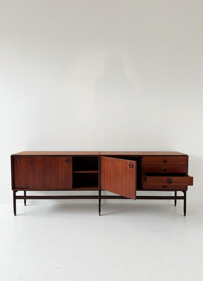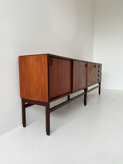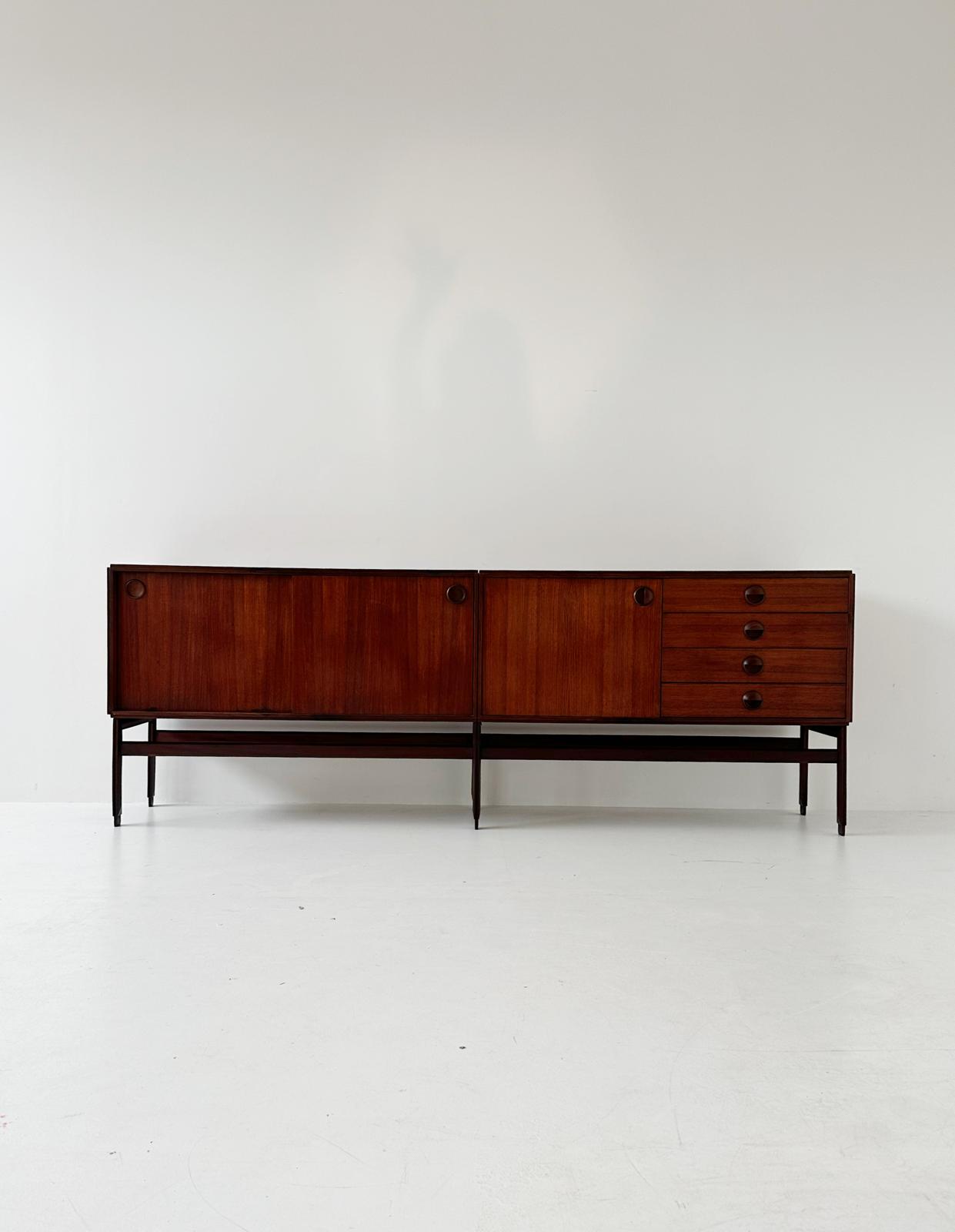 Il mobile nella foto è un sideboard anni ’60, caratterizzato da un design minimalista e linee pulite tipiche del modernismo di quel periodo. È realizzato in legno con una finitura di colore scuro che esalta le venature naturali del materiale. La struttura poggia su gambe sottili, conferendo al mobile un aspetto elegante e leggero.