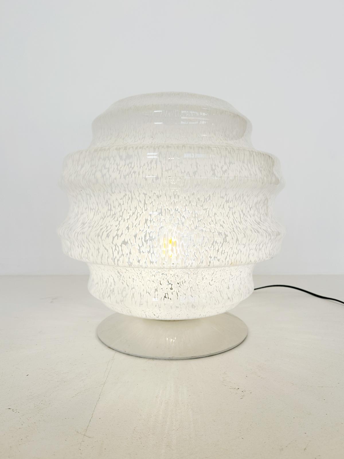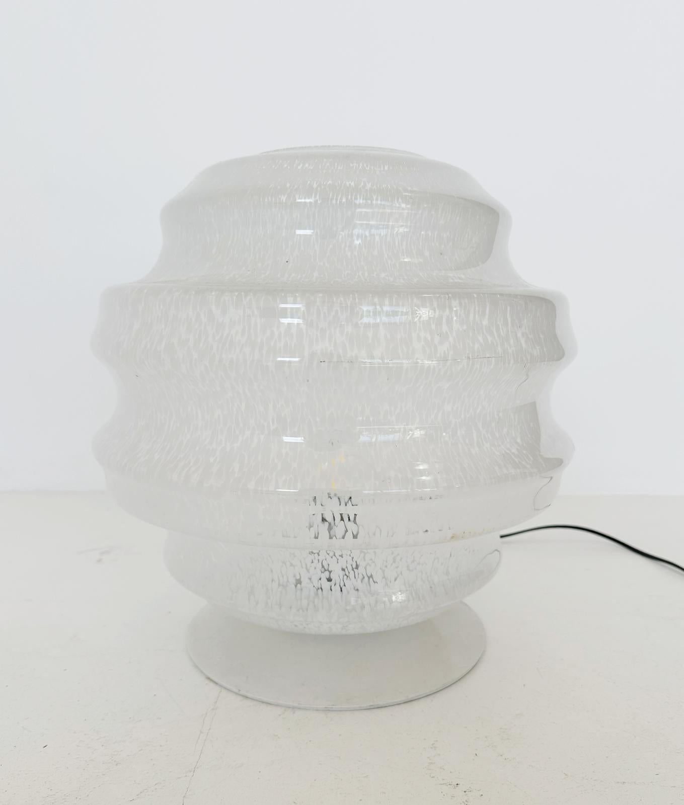 La base è circolare e probabilmente realizzata in metallo o vetro spesso, e serve a dare stabilità alla struttura superiore in vetro. La lampada funziona tramite una lampadina interna, visibile in trasparenza, che emana luce attraverso le pareti screziate, enfatizzando ulteriormente l'effetto decorativo del vetro. Il design è tipico del periodo, unendo funzionalità ed un'estetica elegante e senza tempo.