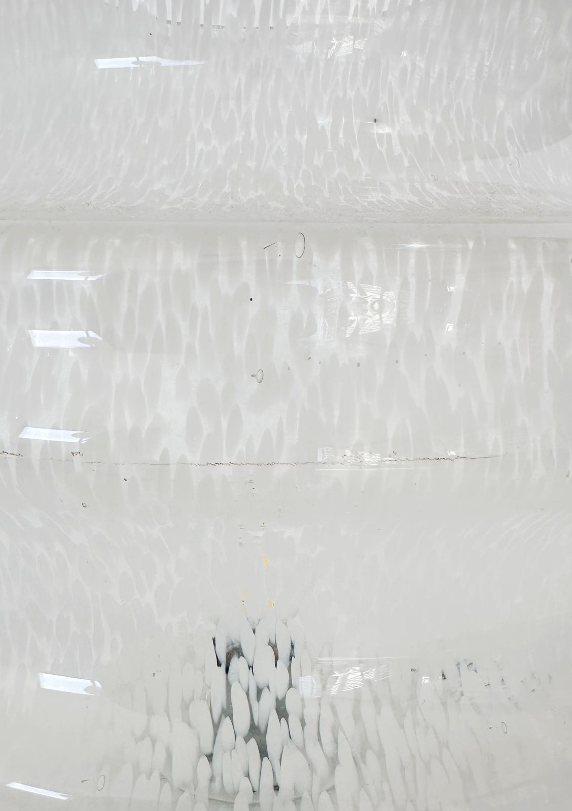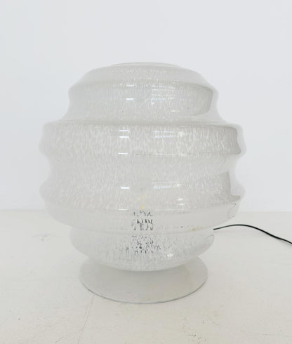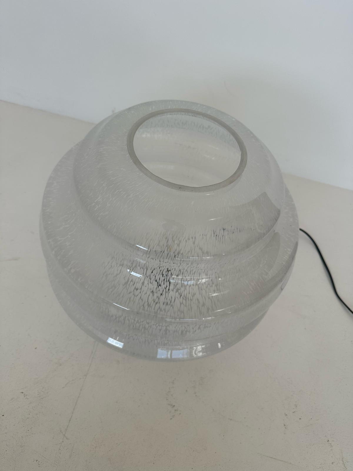 Questa lampada degli anni '60 presenta un design distintivo e organico tipico del modernismo di quel periodo. È realizzata in vetro dalla texture particolarmente interessante: il vetro è decorato con un motivo granuloso o screziato, che diffonde la luce in modo soffuso, creando un'atmosfera calda e accogliente. La forma è ondulata, con una serie di livelli concentrici che danno una sensazione di movimento e fluidità, ricordando la forma di una nuvola o di una conchiglia.