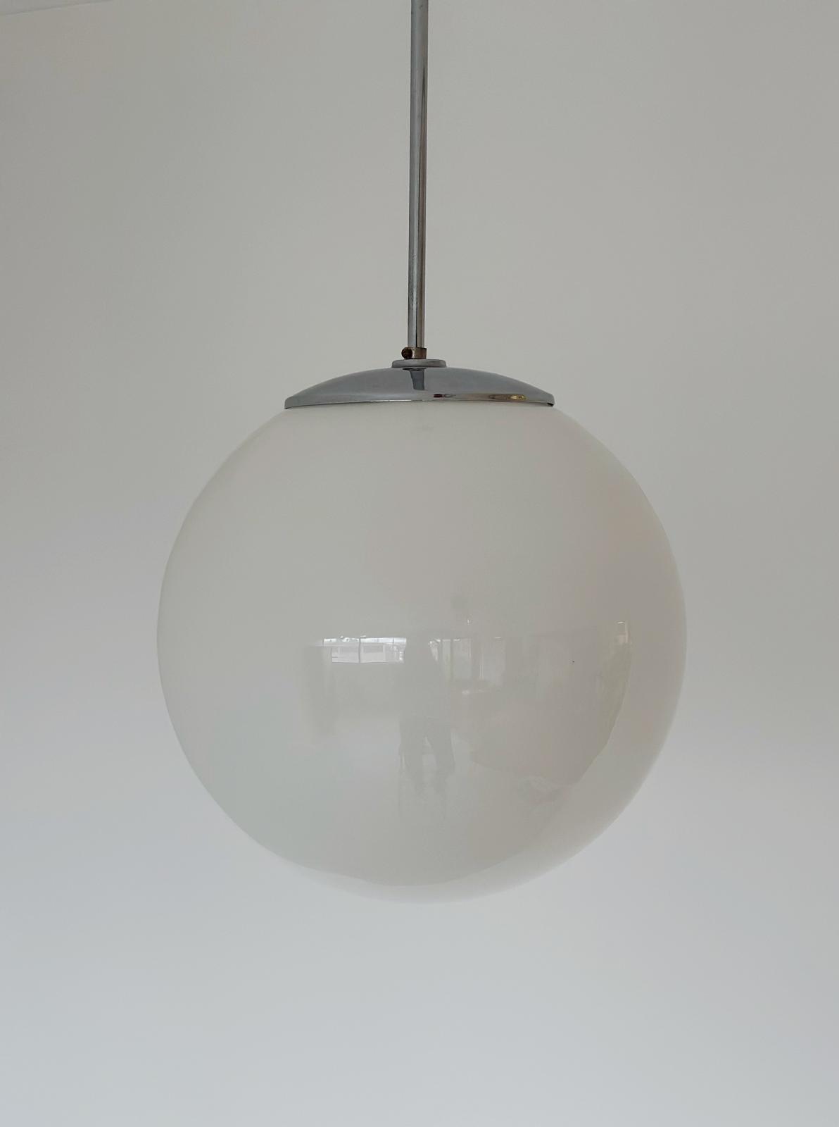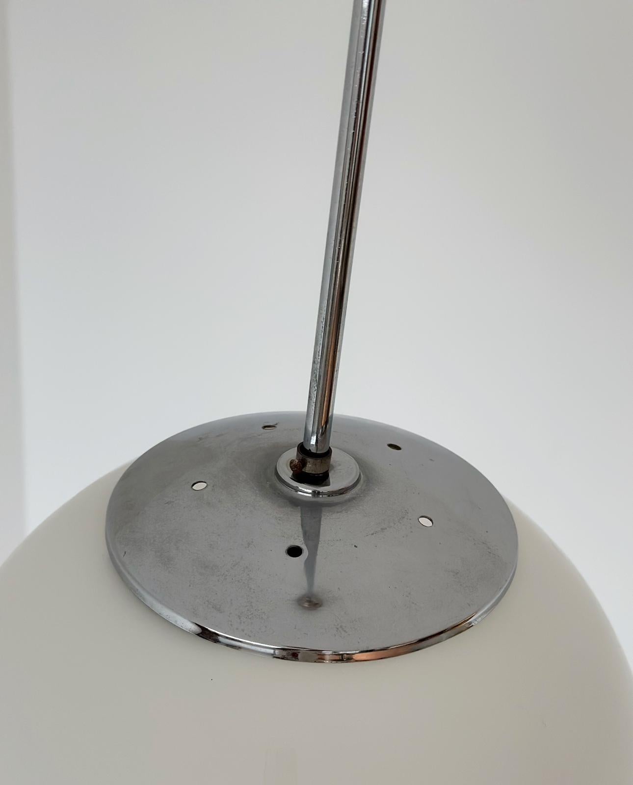 Lampadario,1960, struttura in alluminio, sfera in vetro bianco