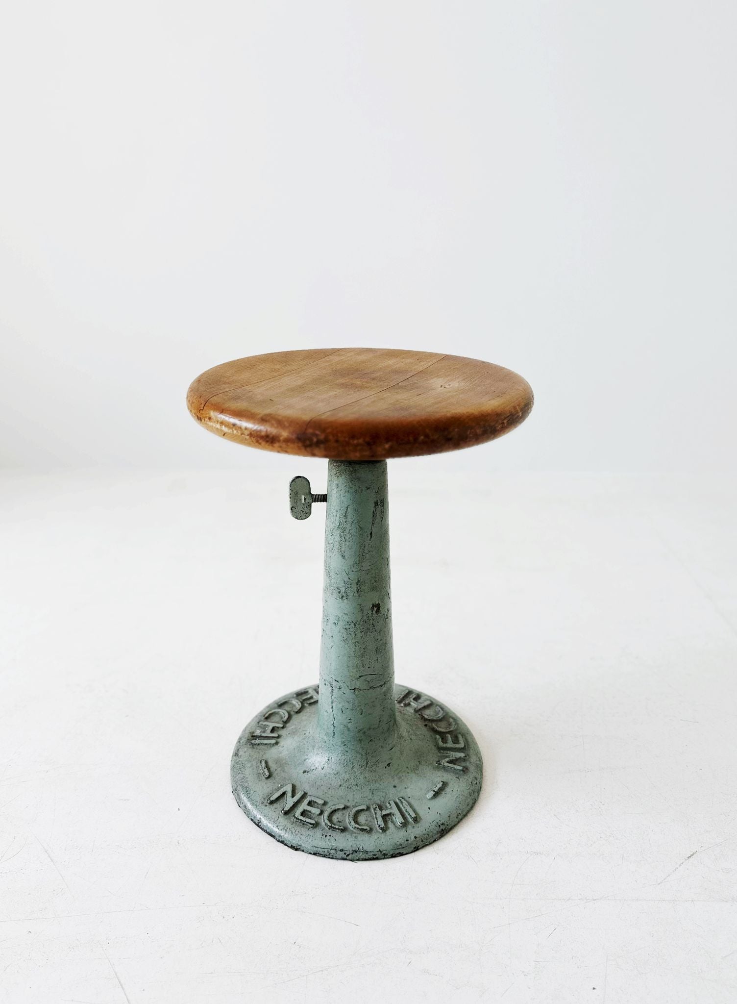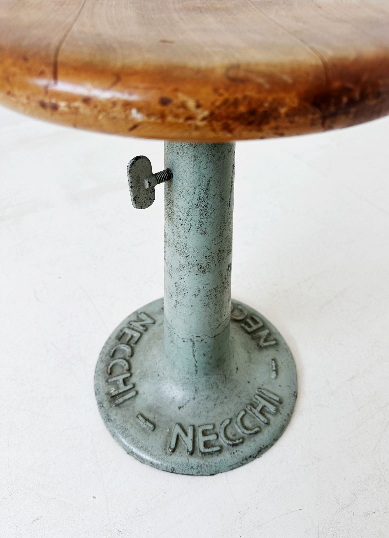 Straordinario esemplare originale di sgabello Necchi degli anni '20, la struttura, realizzata interamente in ghisa, presenta la caratteristica base circolare con l'iconico logo Necchi in rilievo, il meccanismo di regolazione dell'altezza, perfettamente funzionante, è caratterizzato da una vite che permette di variare l'altezza della seduta in base alle proprie esigenze. La seduta circolare in legno massello è stata conservata nelle sue condizioni originali.