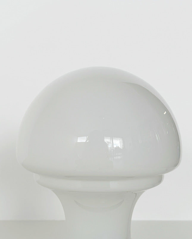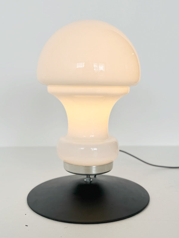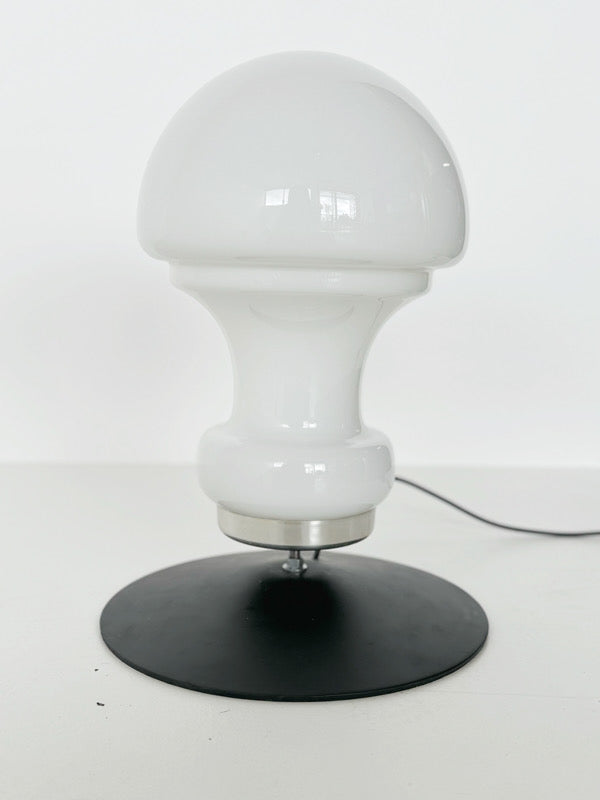 Lampada da tavolo,1960, base in metallo nero e lampada in vetro bianco