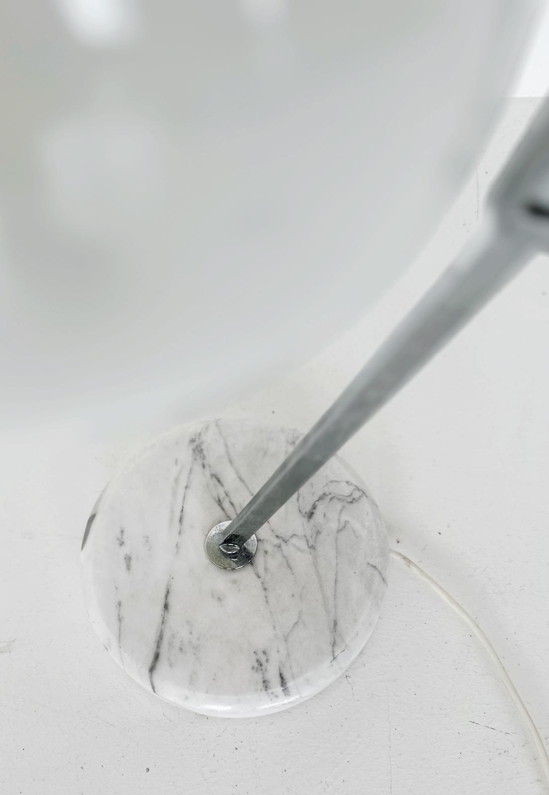 Il braccio metallico, collegato alla base in marmo, presenta una linea semplice e pulita. Nel complesso, il design combina materiali pregiati come il marmo e il metallo con forme arrotondate e morbide, rendendola un pezzo di arredamento iconico del design degli anni ’70.
