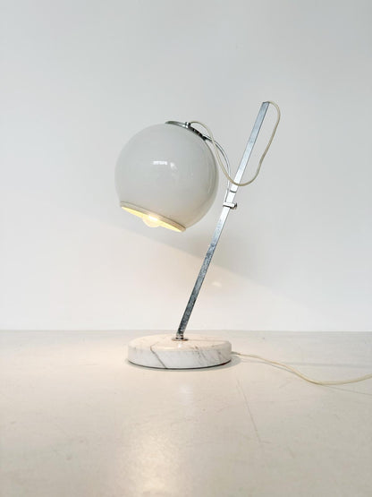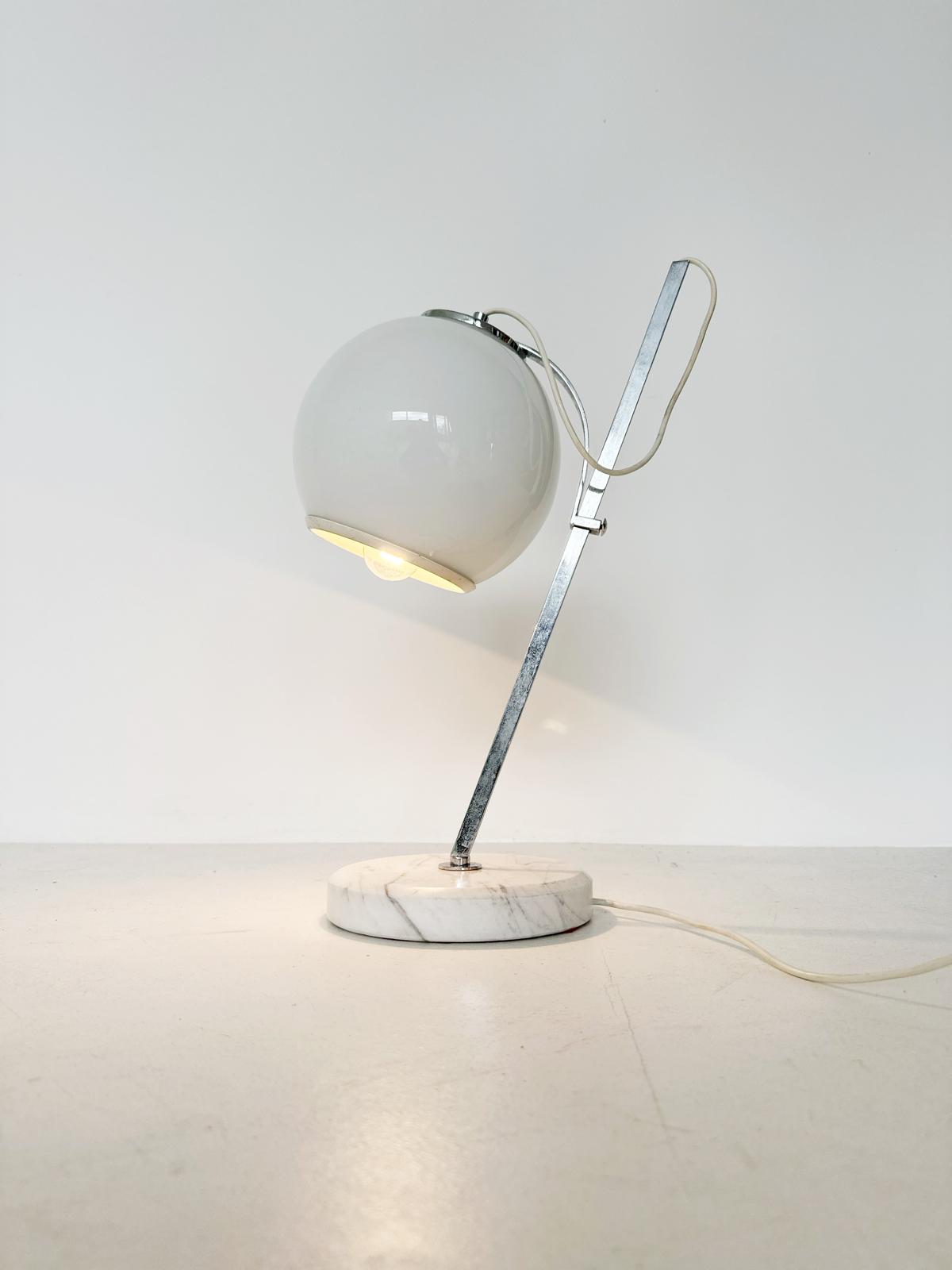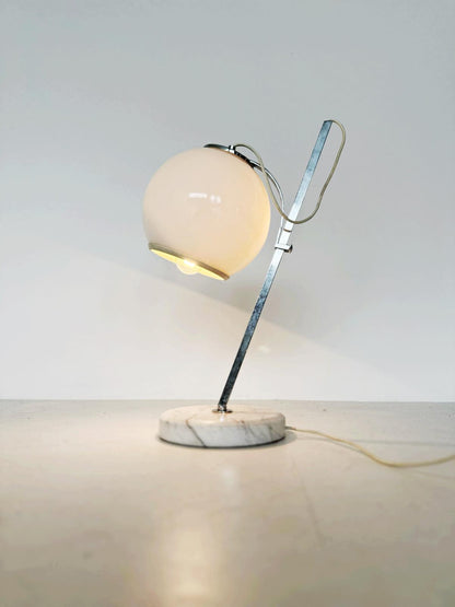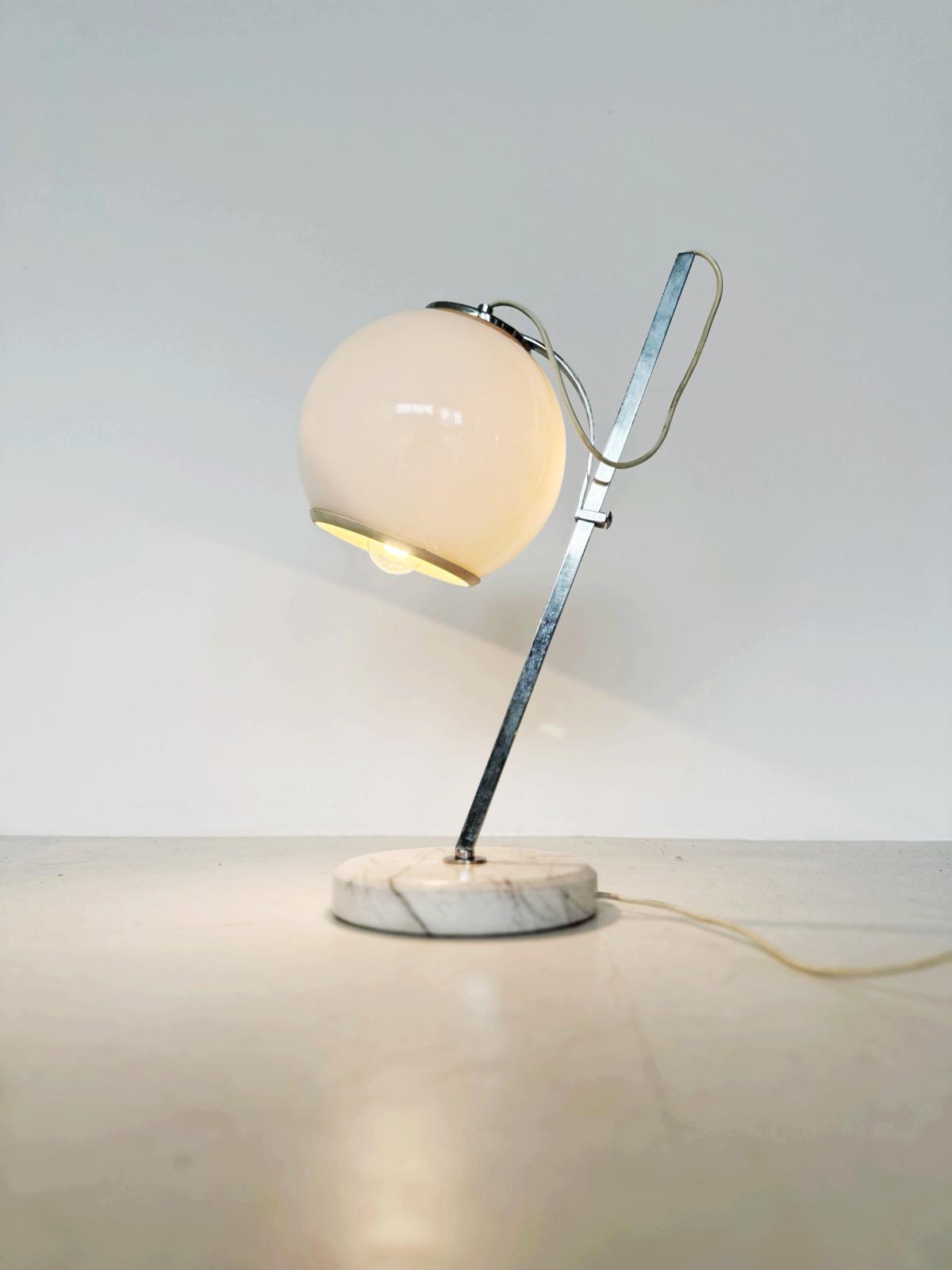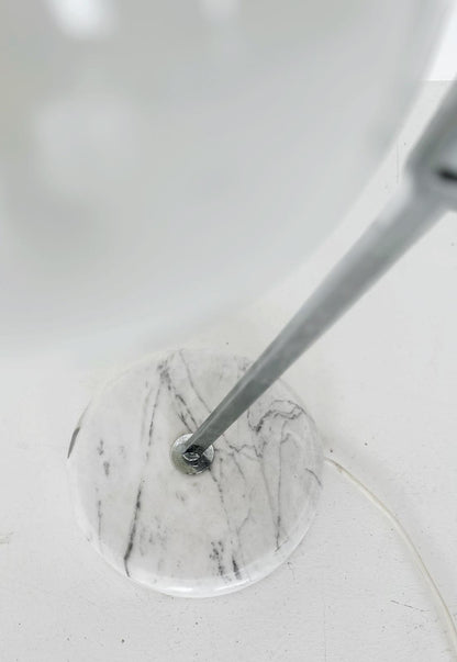 Questa lampada degli anni ’70 ha un design distintivo e retrò, tipico di quel periodo. La base è realizzata in marmo bianco, che le conferisce stabilità e un tocco di eleganza. Il corpo principale della lampada è in metallo cromato, con una struttura inclinata che sostiene un grande paralume sferico bianco. Il paralume ha un aspetto lucido e liscio, con una forma a globo che diffonde la luce in modo uniforme.