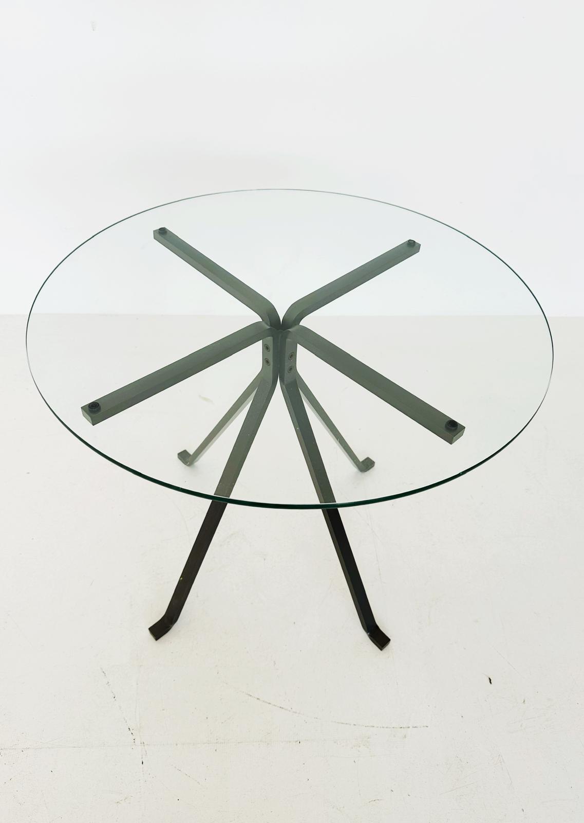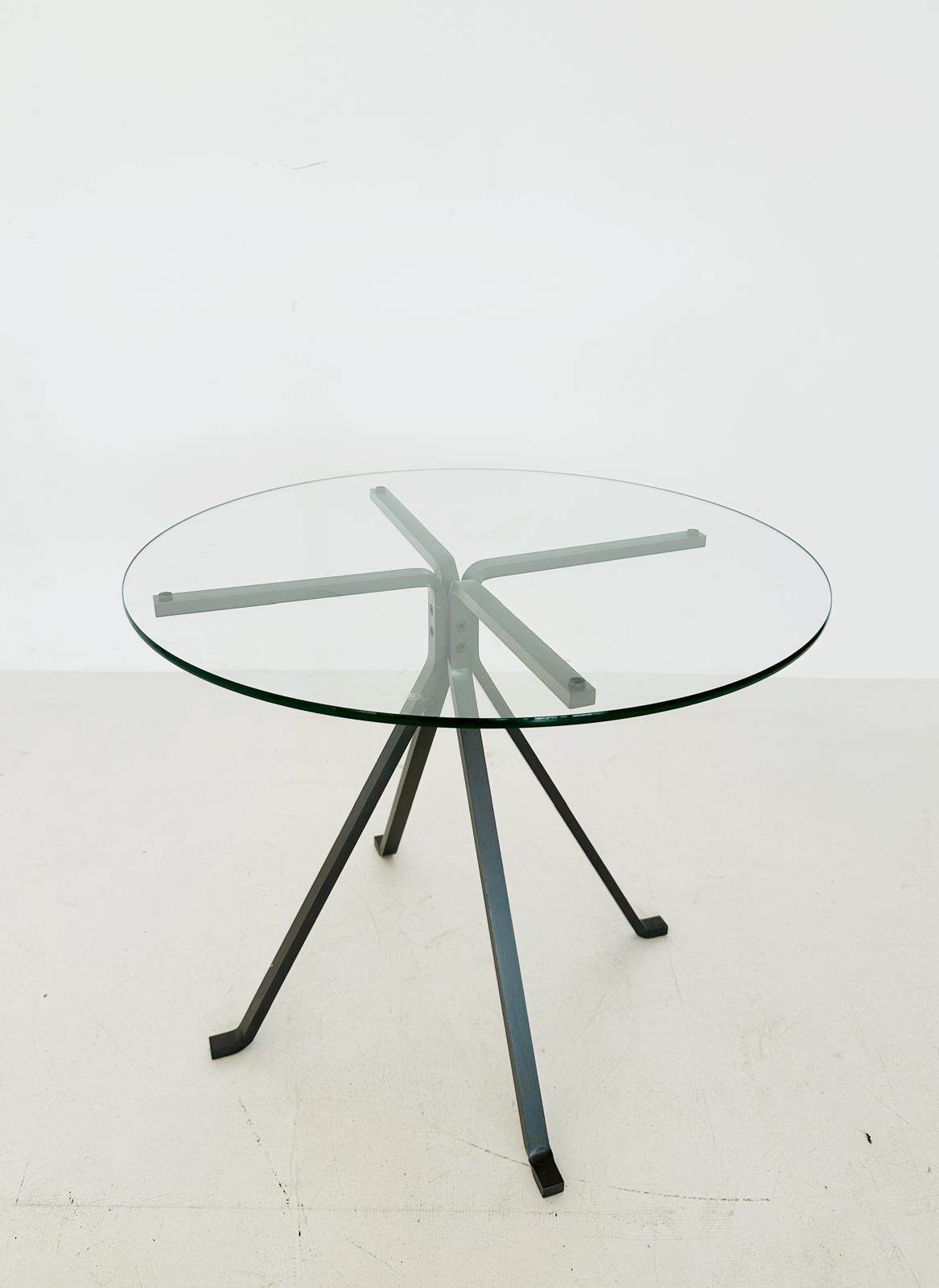 Tavolino modello Cuginetto, con piano rotondo in vetro e gamba centrale in ghisa a quattro razze a sezione rettangolare, con estremità della gamba piegate, che creano un originale dettaglio estetico.