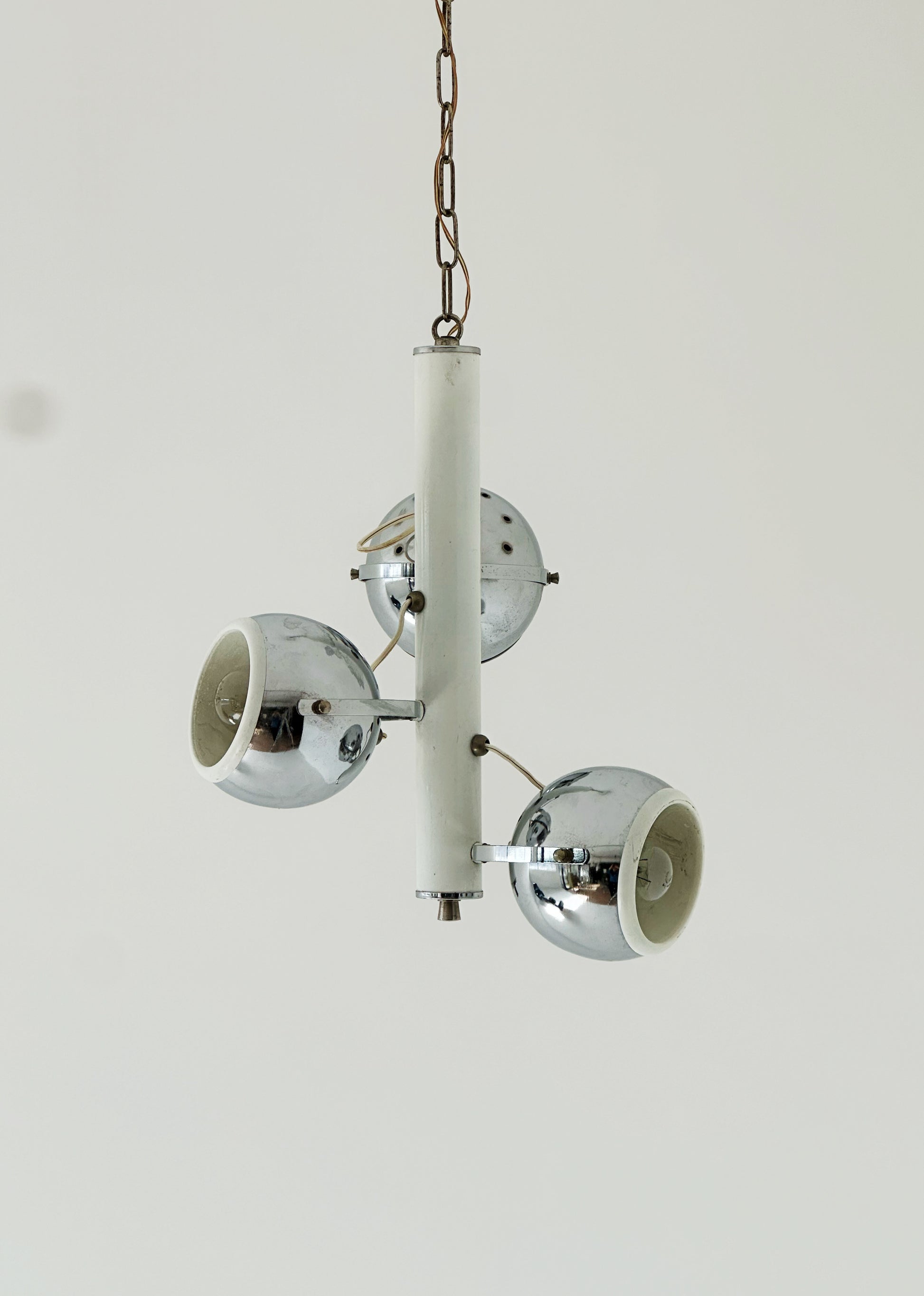 Lampadario,1970, struttura in metallo bianco, tre lampade a occhio in metallo cromato