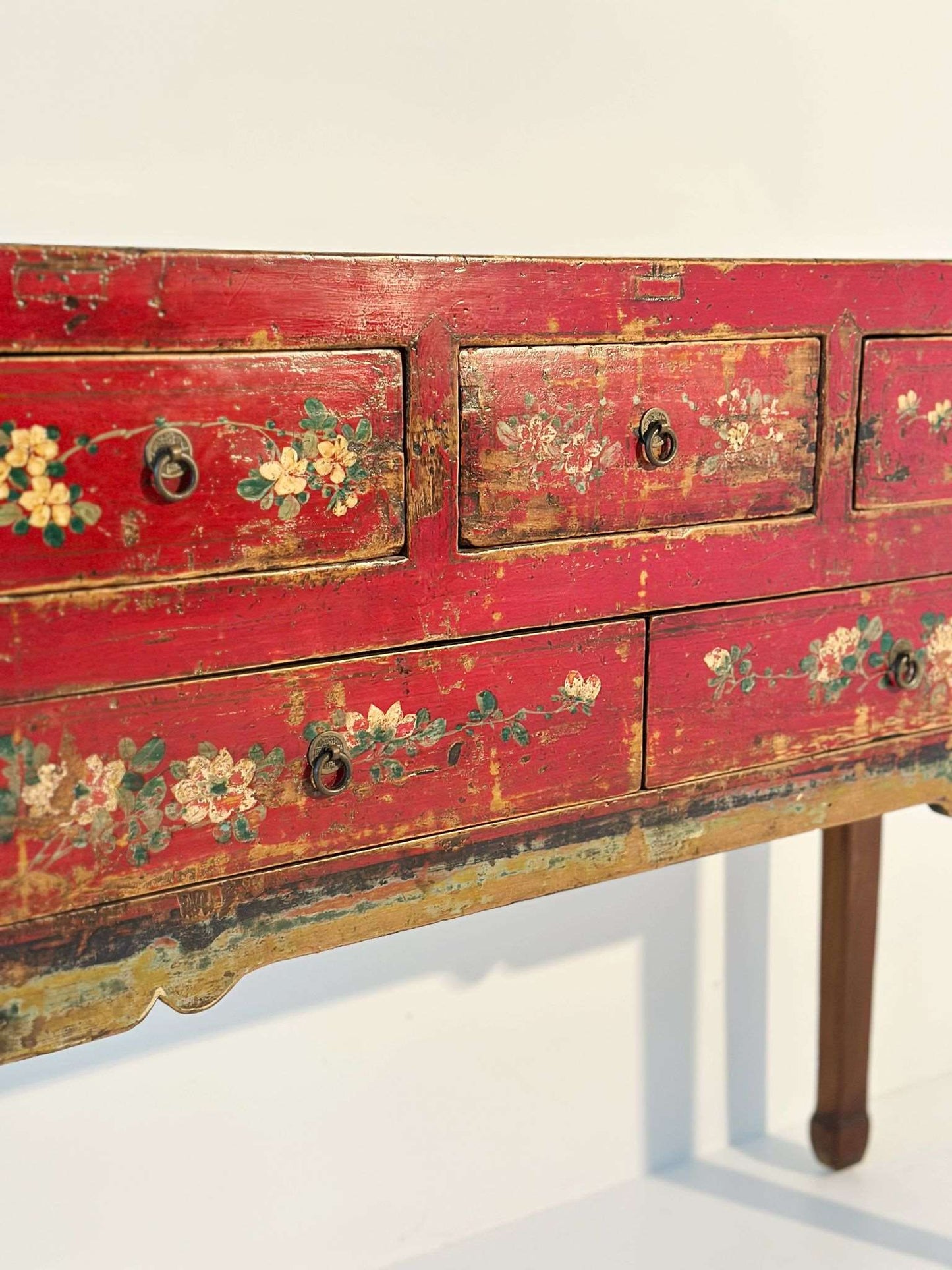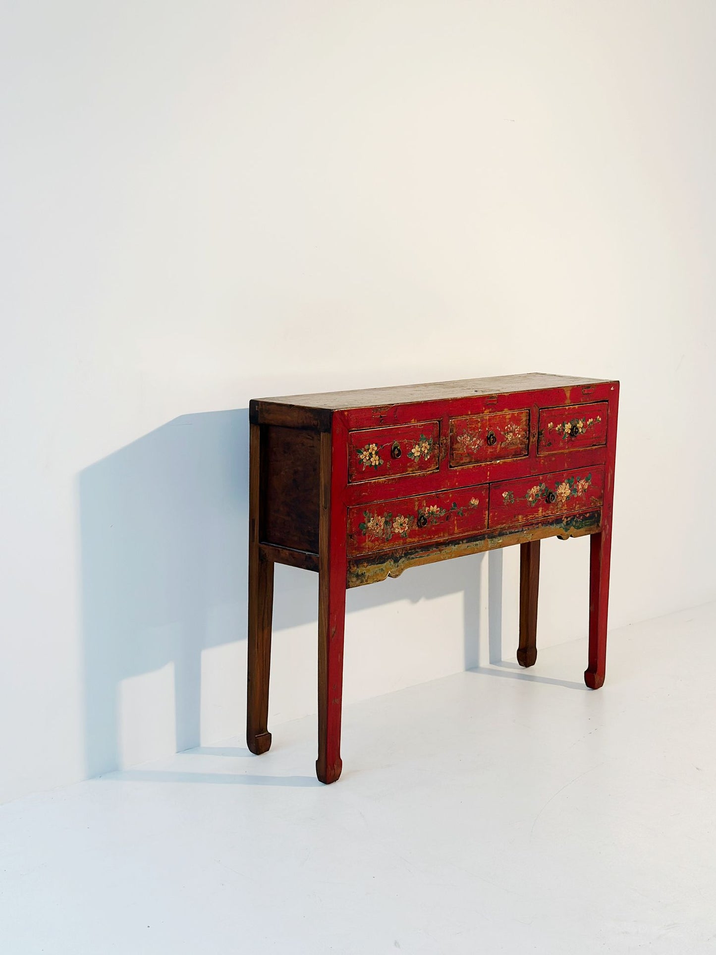 Console balinese, caratterizzata da una combinazione di elementi rustici e decorativi tipici dell’artigianato del sud-est asiatico. Il mobile è di legno, con una struttura semplice e squadrata, che poggia su quattro gambe strette e slanciate. La parte superiore e i lati sono in legno naturale non trattato, mentre la parte frontale è dominata da un’intensa verniciatura rossa, segnata dall’usura e dal tempo, che conferisce un aspetto vissuto e vintage.