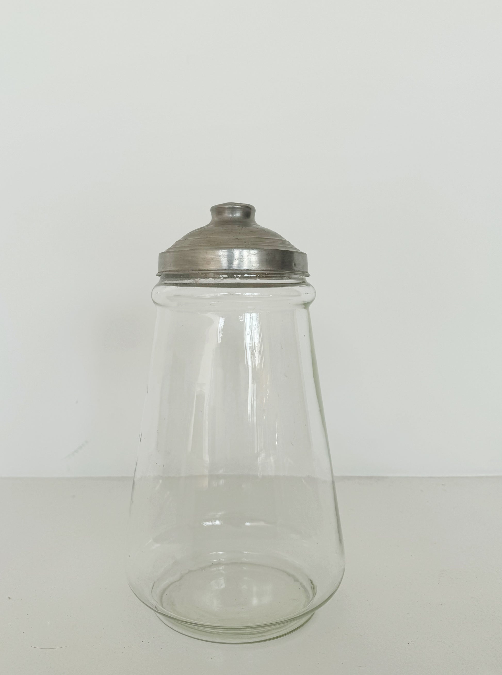 Vaso portacaramelle,1960, vaso in vetro soffiato, con tappo in alluminio