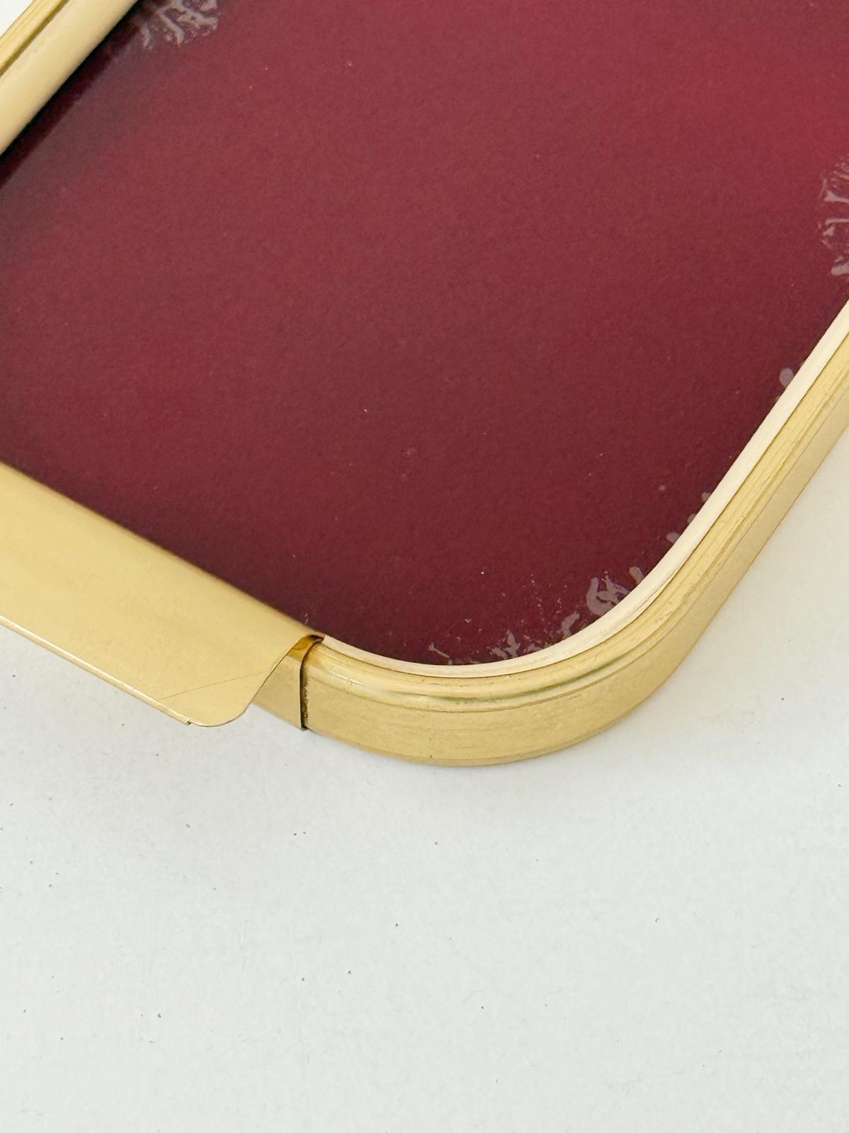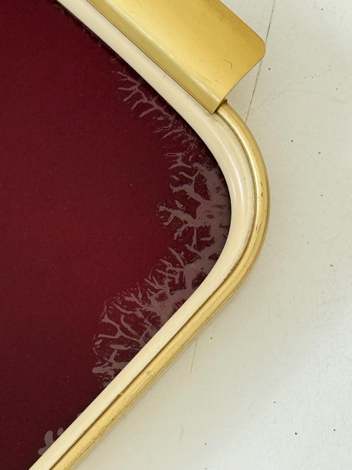 Raffinato vassoio vintage con struttura in metallo dorato satinato e piano in vetro color bordeaux profondo, caratterizzato da un elegante effetto craquelé sui bordi.