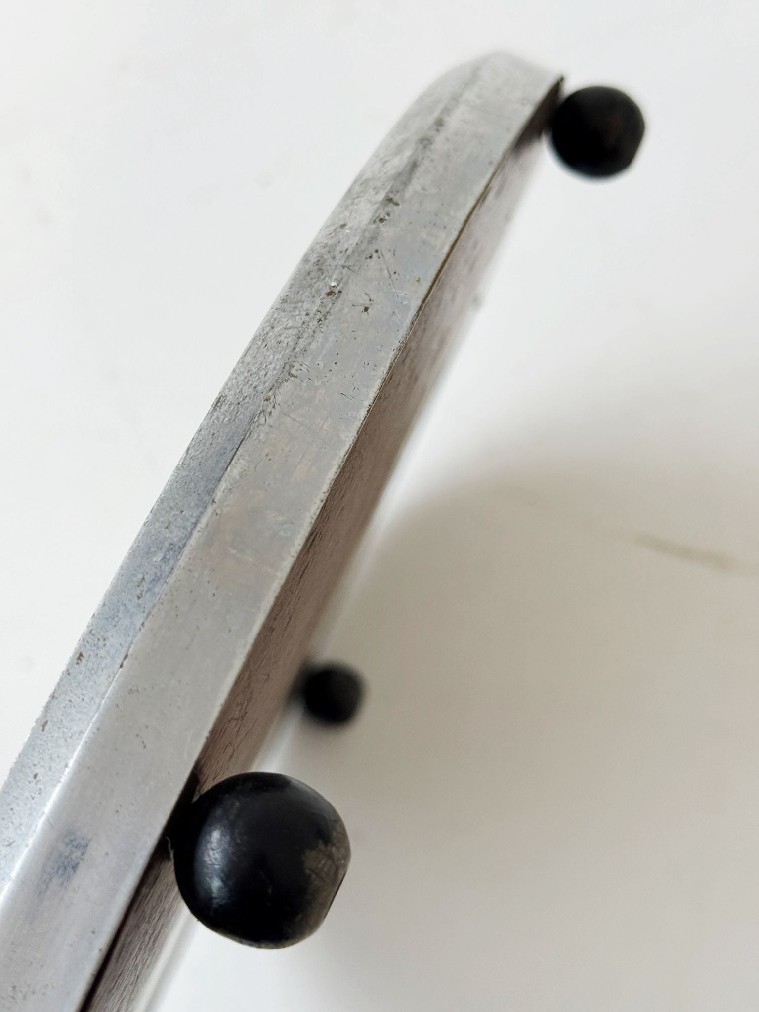 La struttura presenta un bordo cromato leggermente bombato e piedini neri inferiori che sollevano il vassoio e lo rendono stabile.